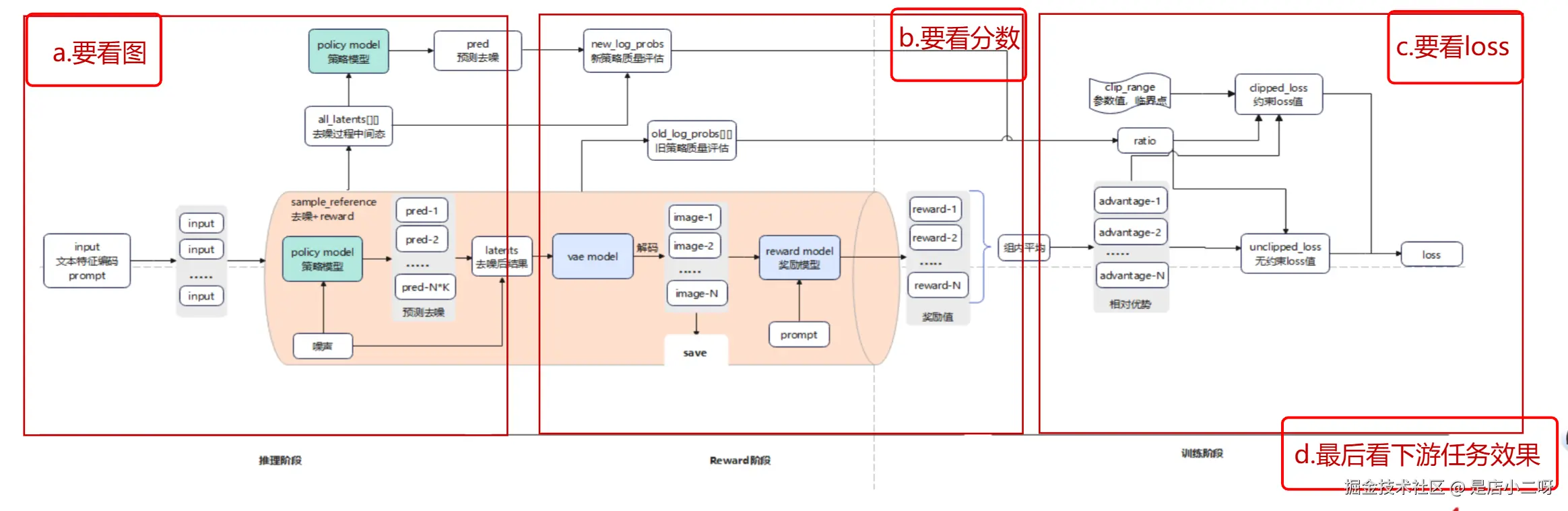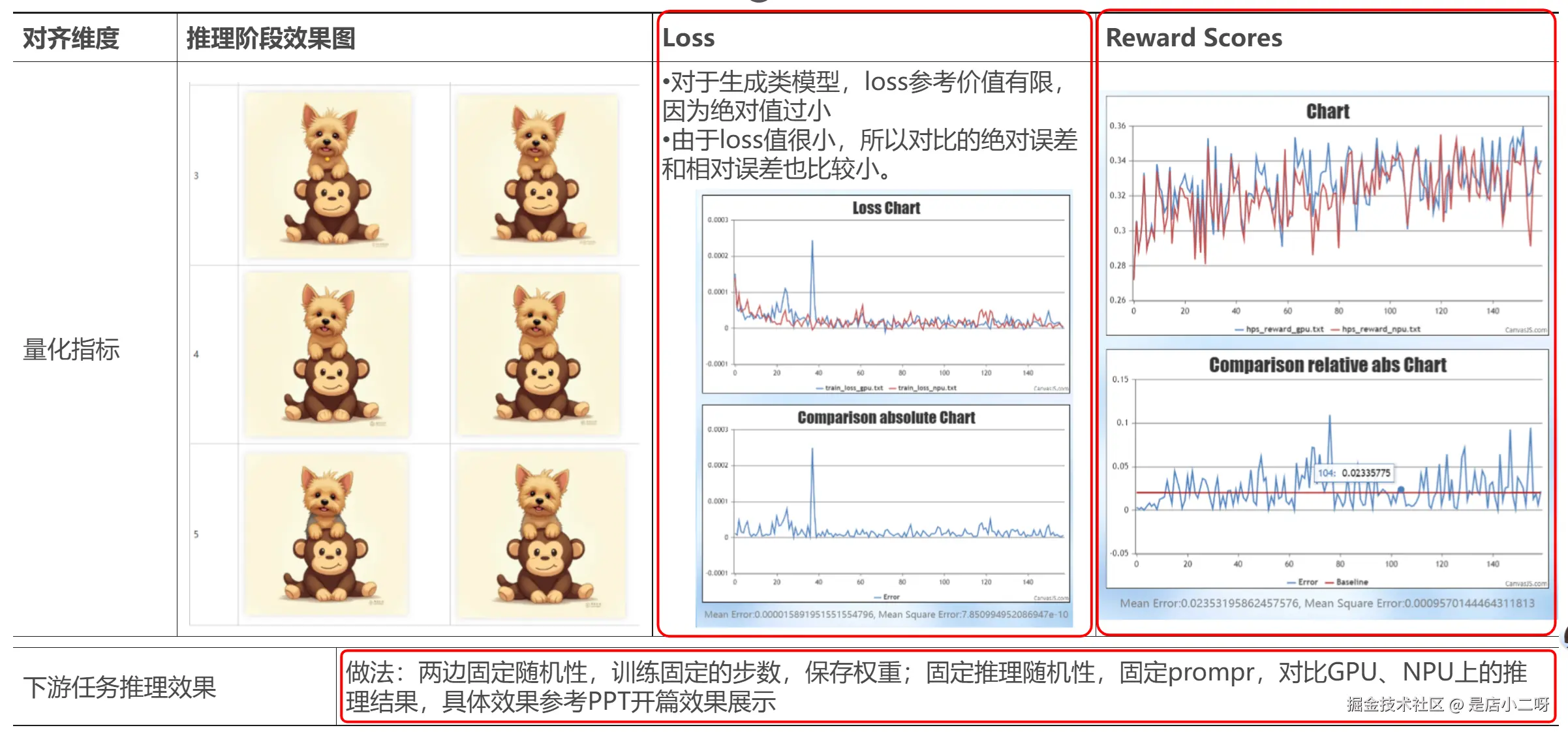 端到端对齐流程主要关注两方面,一方面是综合度量模型训练的指标:推理阶段图片+loss+rward scores,另一方面是下游任务推理效果。