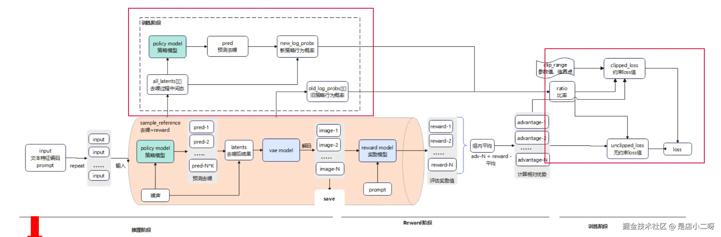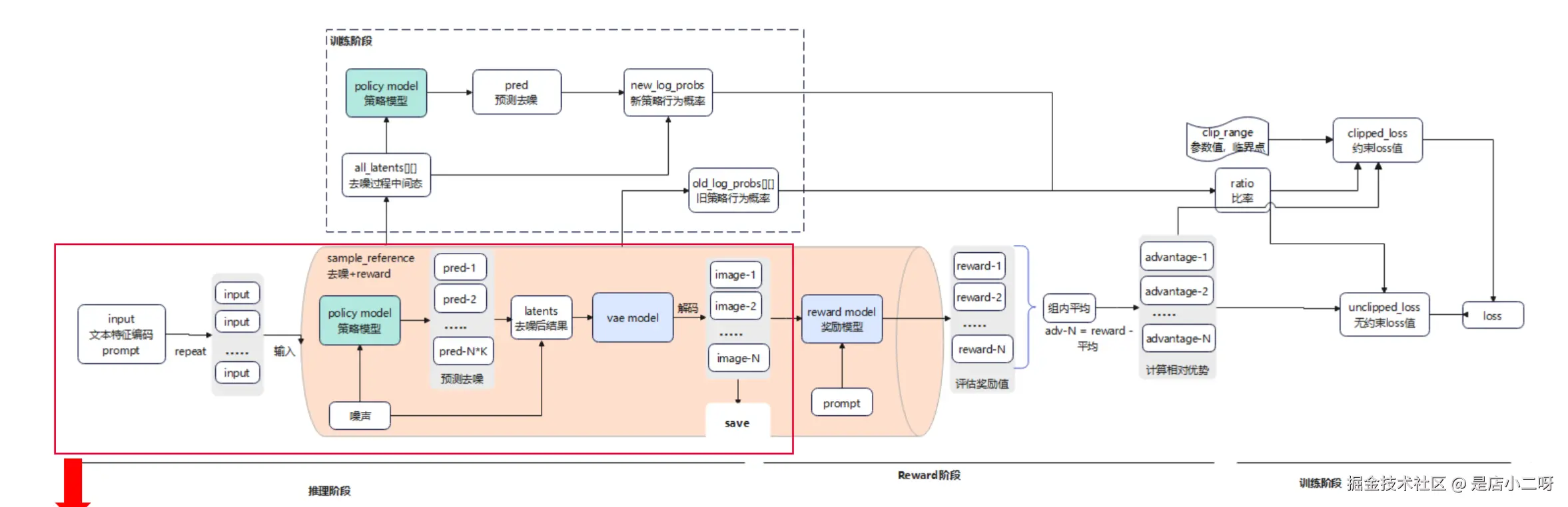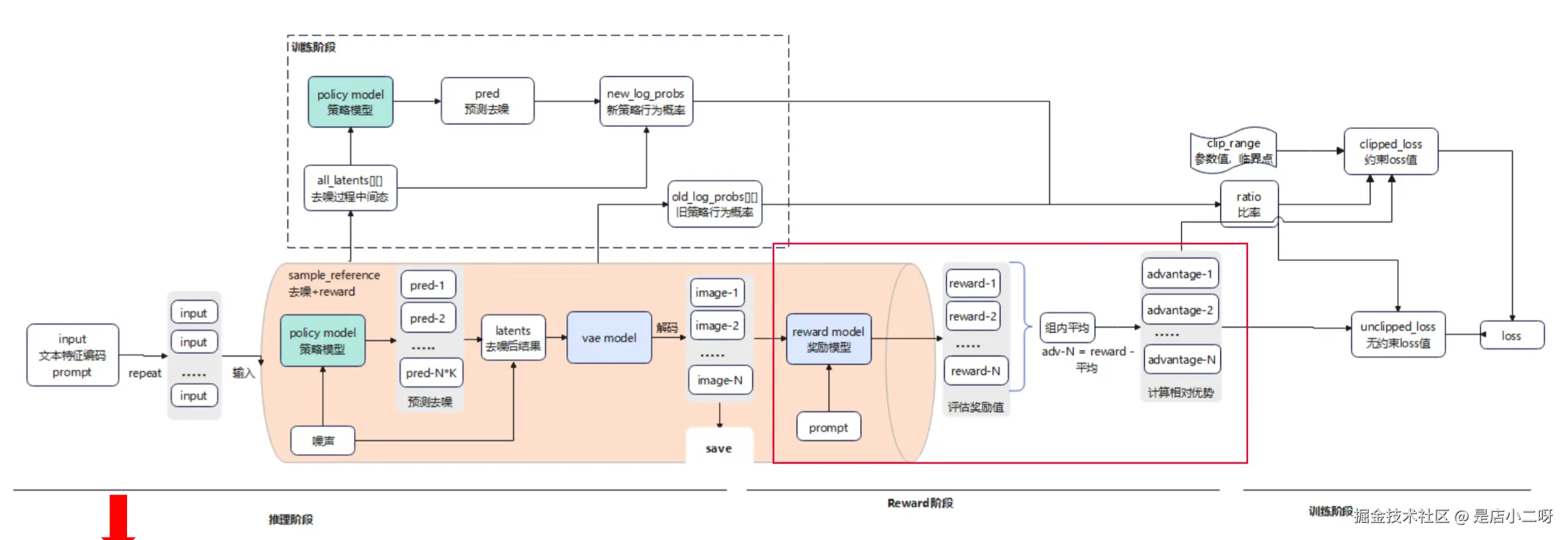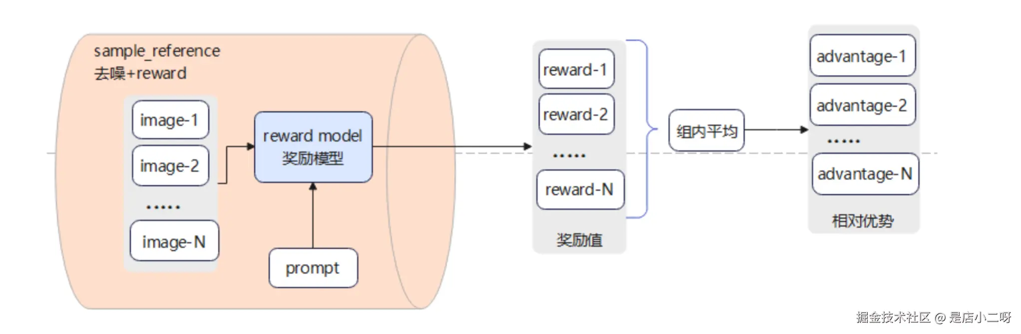 - 计算 reward 值:基于 prompt,图例阶段得到的完全去噪的 image 值,输入到 reward mode 中,经过一系列计算得到每个 image 的 reward 值。