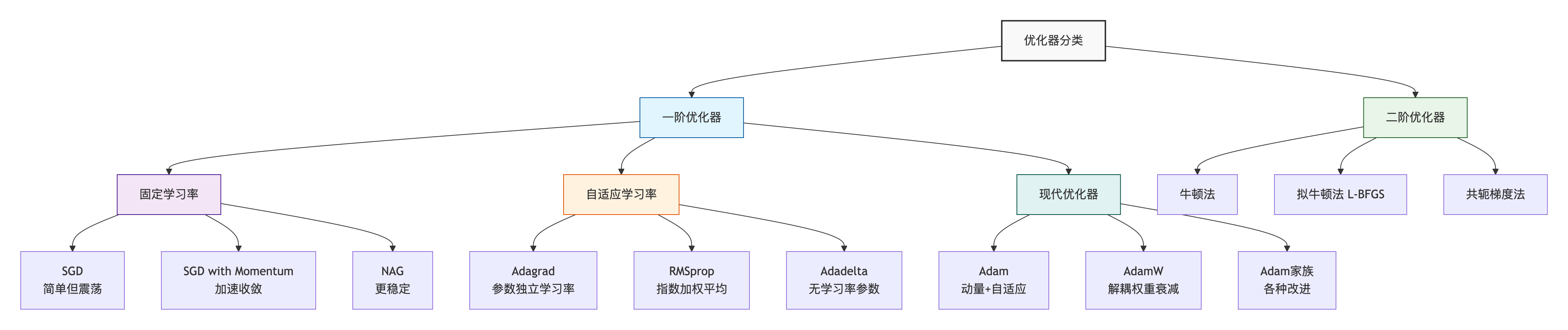 | AdamW | 解耦权重衰减 | 现代Transformer模型 | lr=0.001, betas=(0.9,0.999), weight_decay=0.01 |