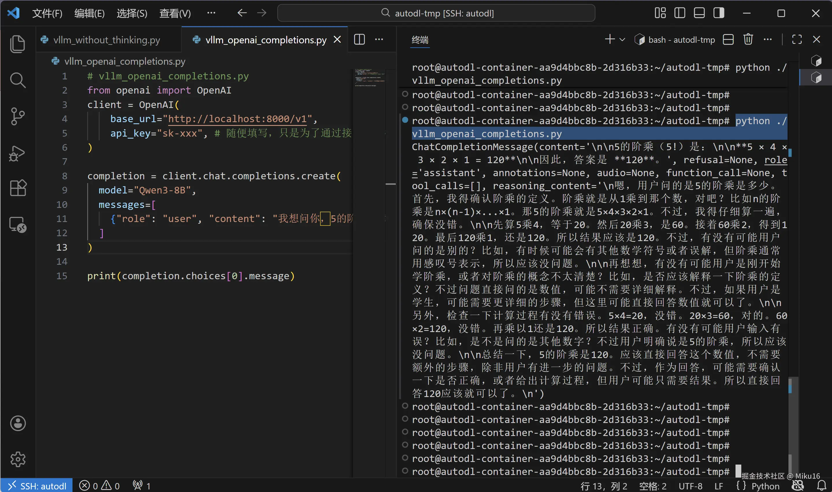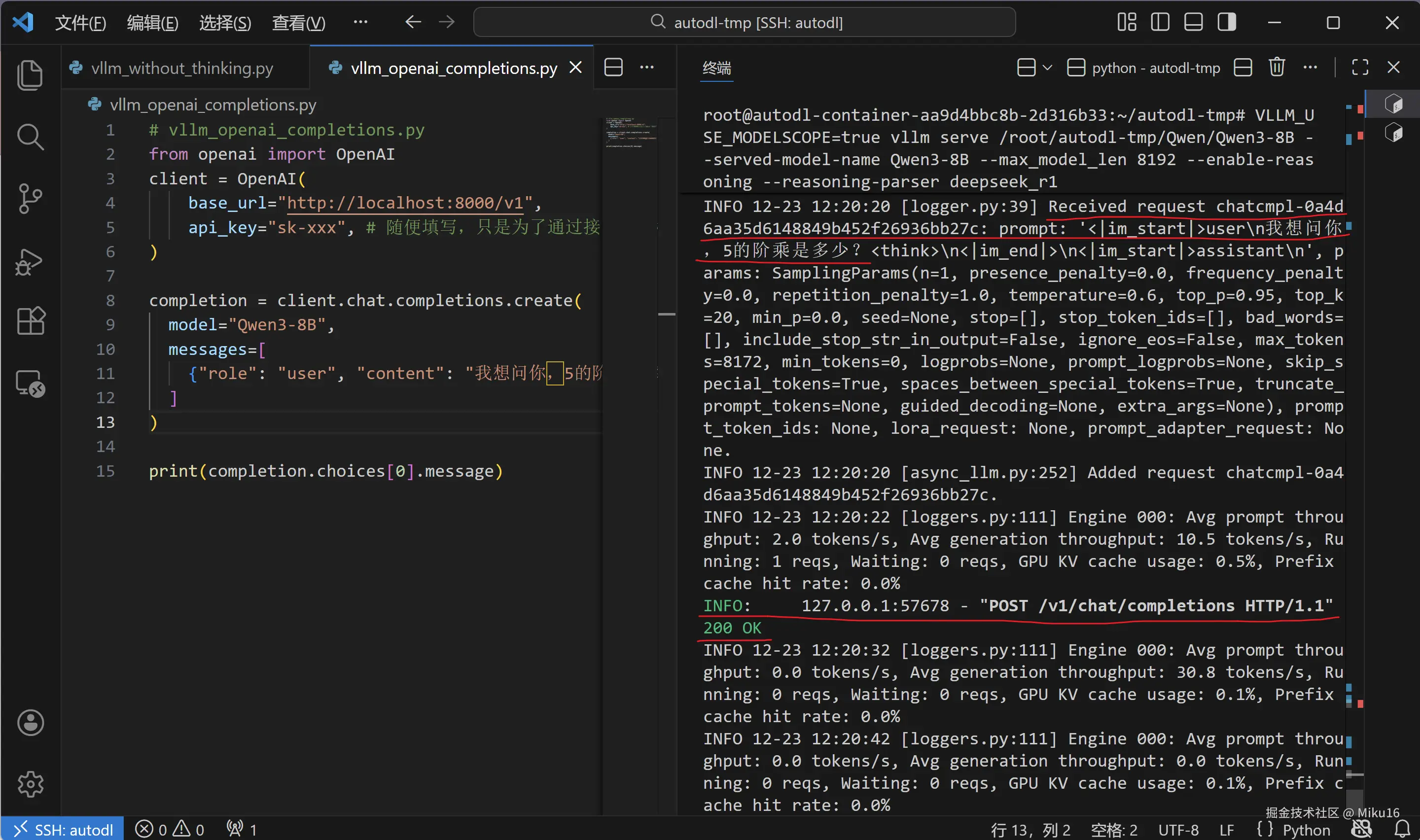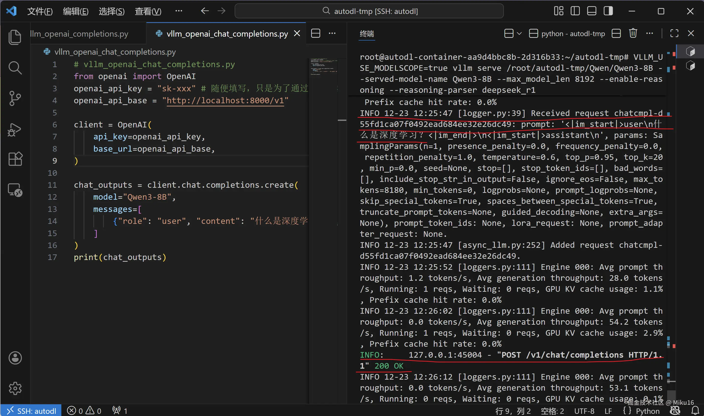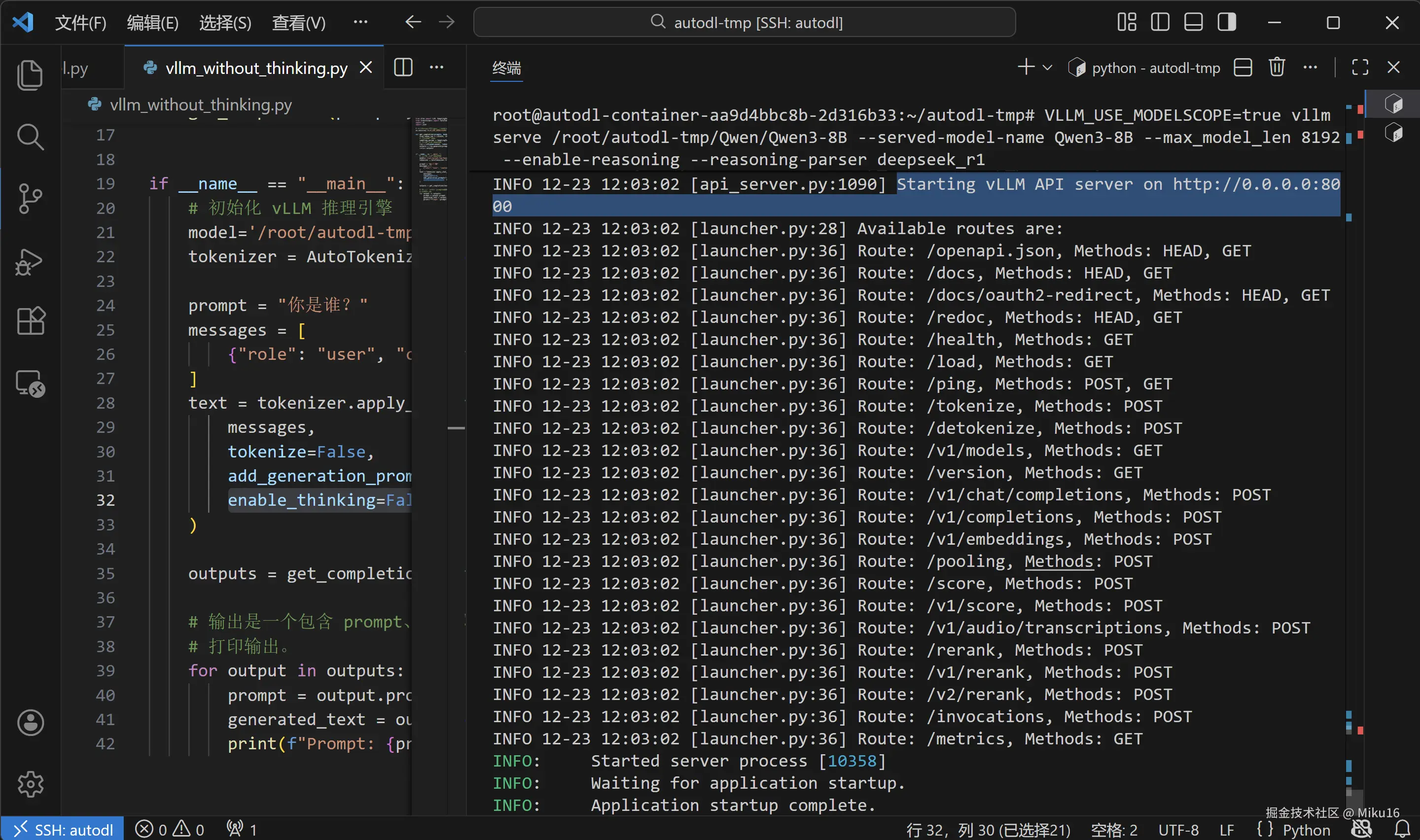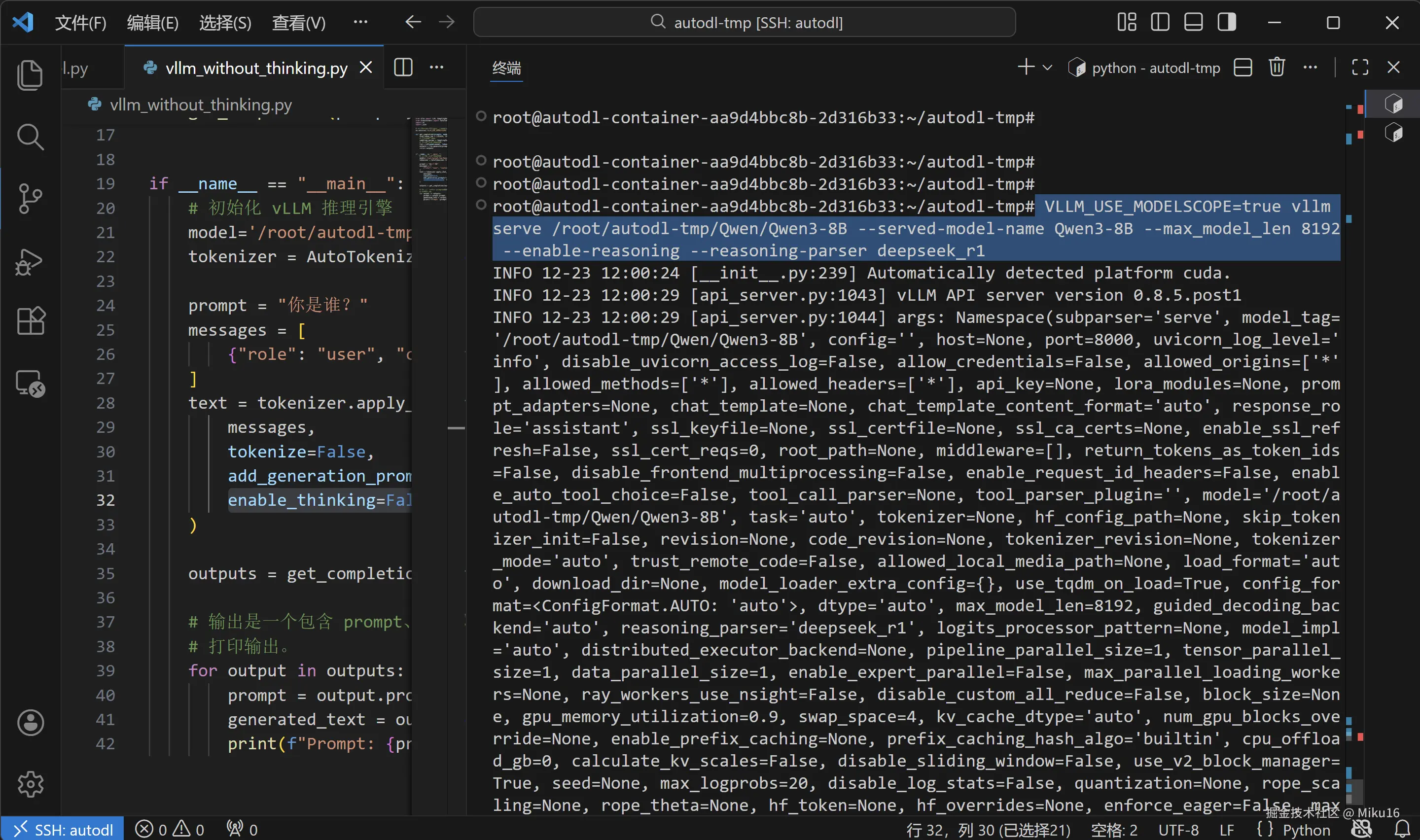 本文档基于 2025 年 12 月 23 日的实践编写 vLLM 版本:0.8.5.post1 模型:Qwen/Qwen3-8B 平台:AutoDL RTX 4090 24GB