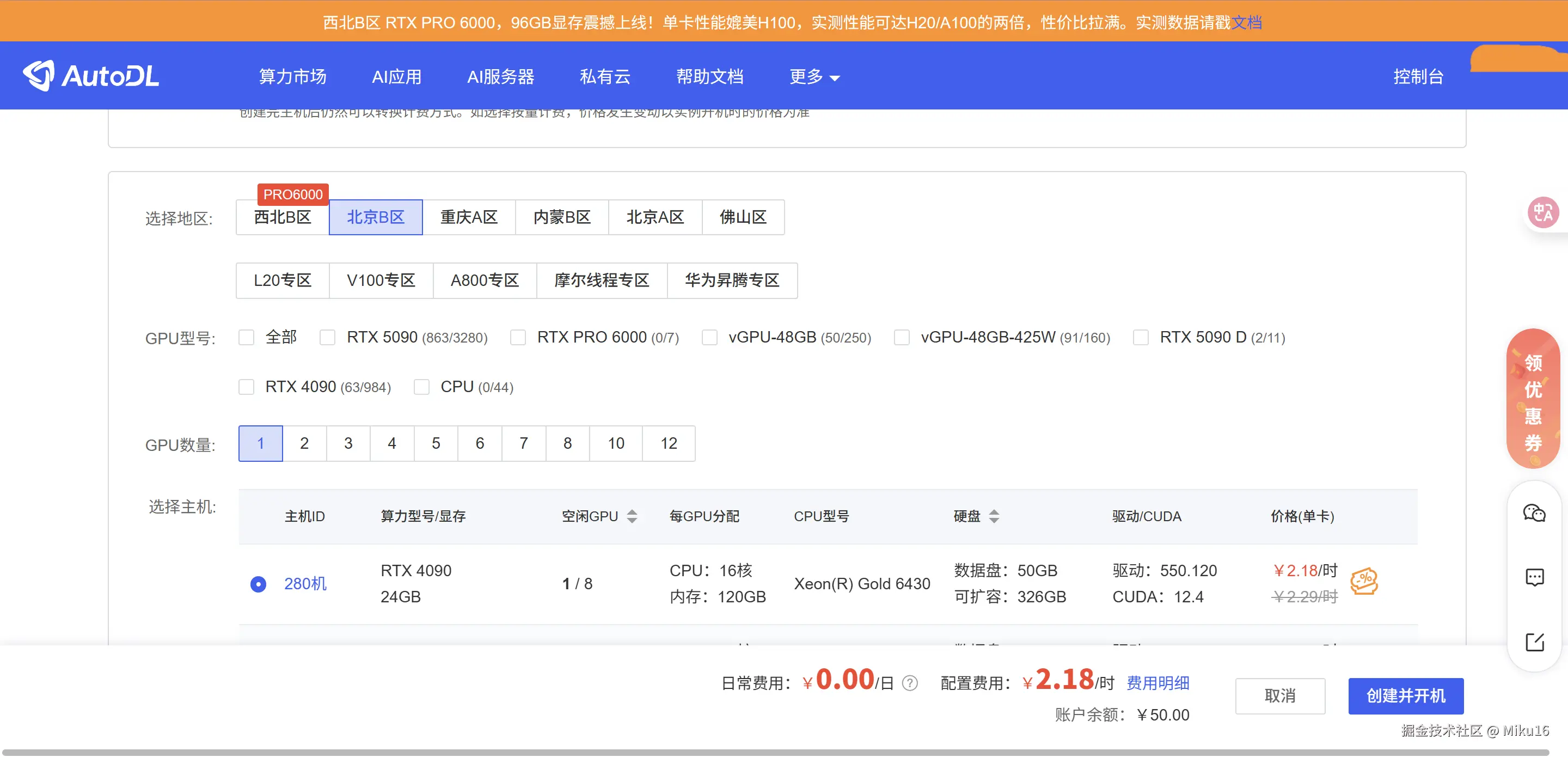 【截图:AutoDL 实例创建页面 - GPU和镜像选择】