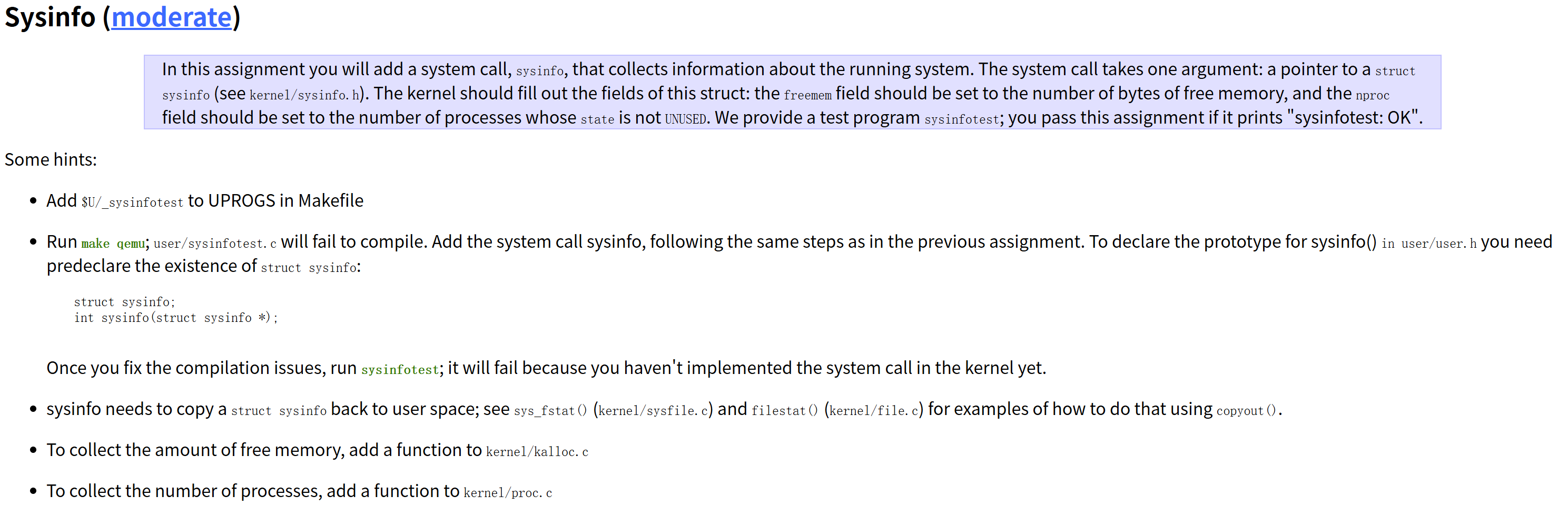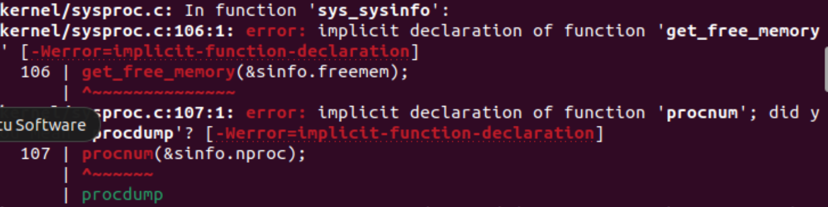 一旦修复了编译问题,就运行sysinfotest;但由于您还没有在内核中实现系统调用,执行将失败。