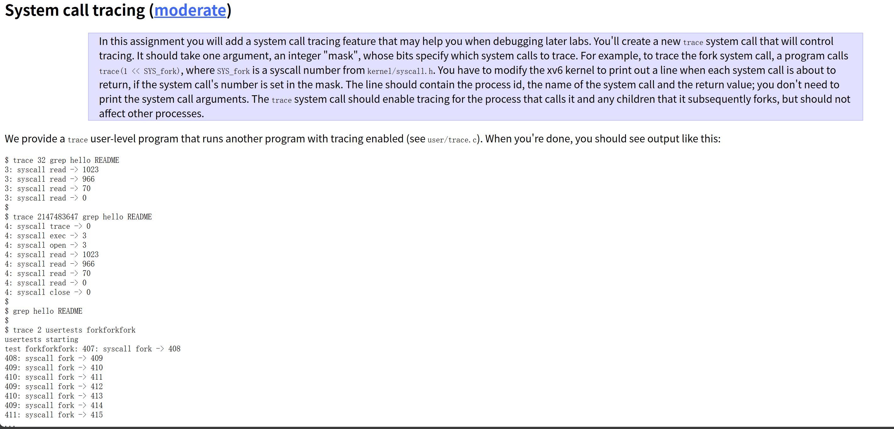 其中trace(atoi(argv[1]),调用了系统调用,把参数掩码传入内核,之后通过 exec() 执行目标程序,让目标程序继承当前进程的跟踪掩码,从而实现对目标程序系统调用的跟踪。