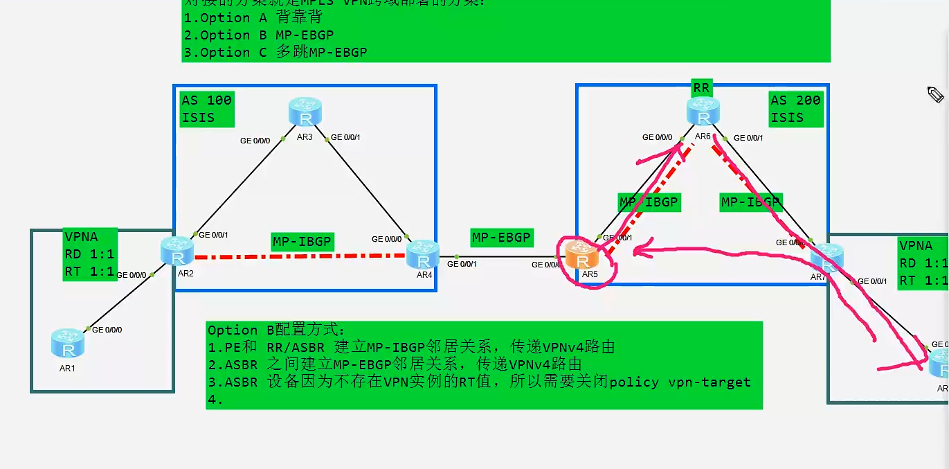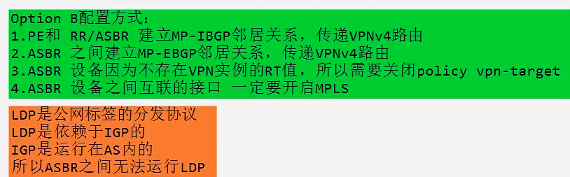 - LDP 的冗余性:LDP 用于非直连公网设备间建立 LSP、分发公网标签,而 Option B 中 ASBR 为直连关系,通过 IGP 即可实现公网 IP 直达,无需 LDP 构建转发路径。