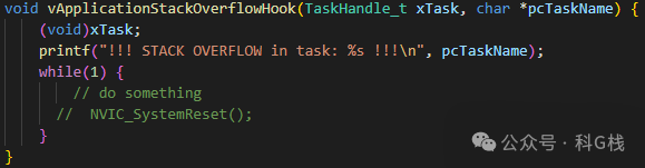 FreeRTOS还提供了栈溢出钩子函数,发生栈溢出时调用,它只能做一些善后工作,无法恢复系统,