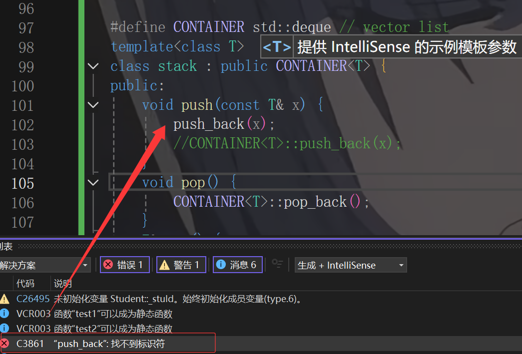 此时调用push(),会实例化stack的push()成员,但若push()中的push_back()没有指定类域(如下图),就会导致编译器会先在stack的作用域中查找push_back(),找不到,再去基类中查找,但此时基类为一个模板类,其中的push_abck()此前并未被实例化过,从而导致编译器找不到成员push_back(),致使编译出错。