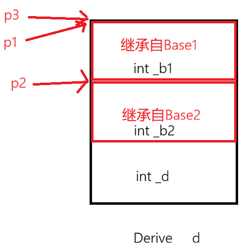 由于Derive类多继承了Base1和Base2,p1p2分别为其基类指针,所以可以将d对象的地址赋值给p1p2,而p1则会指向d中继承Base1的那部分地址,p2则会指向d中继承Base2的那部分地址;而Derive先继承Base1,再继承Base2,所以有关系图: