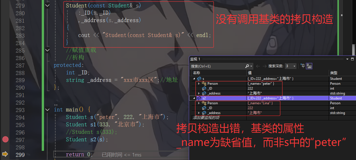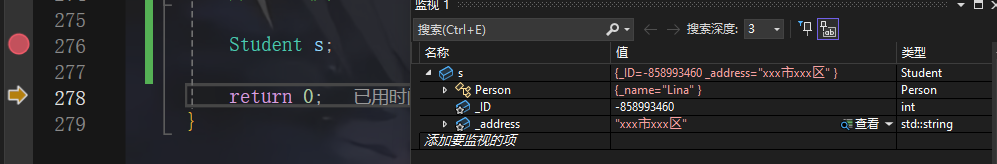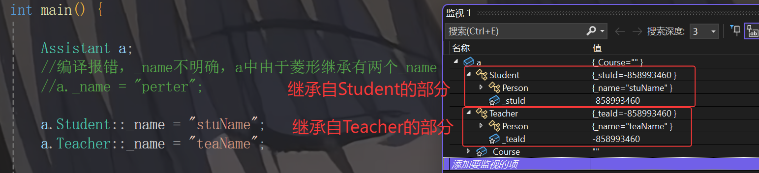 调试中的监视窗口就可以帮助我们看到,继承自两个基类中各有一份Person的内容,指定类域修改的结果也不同。