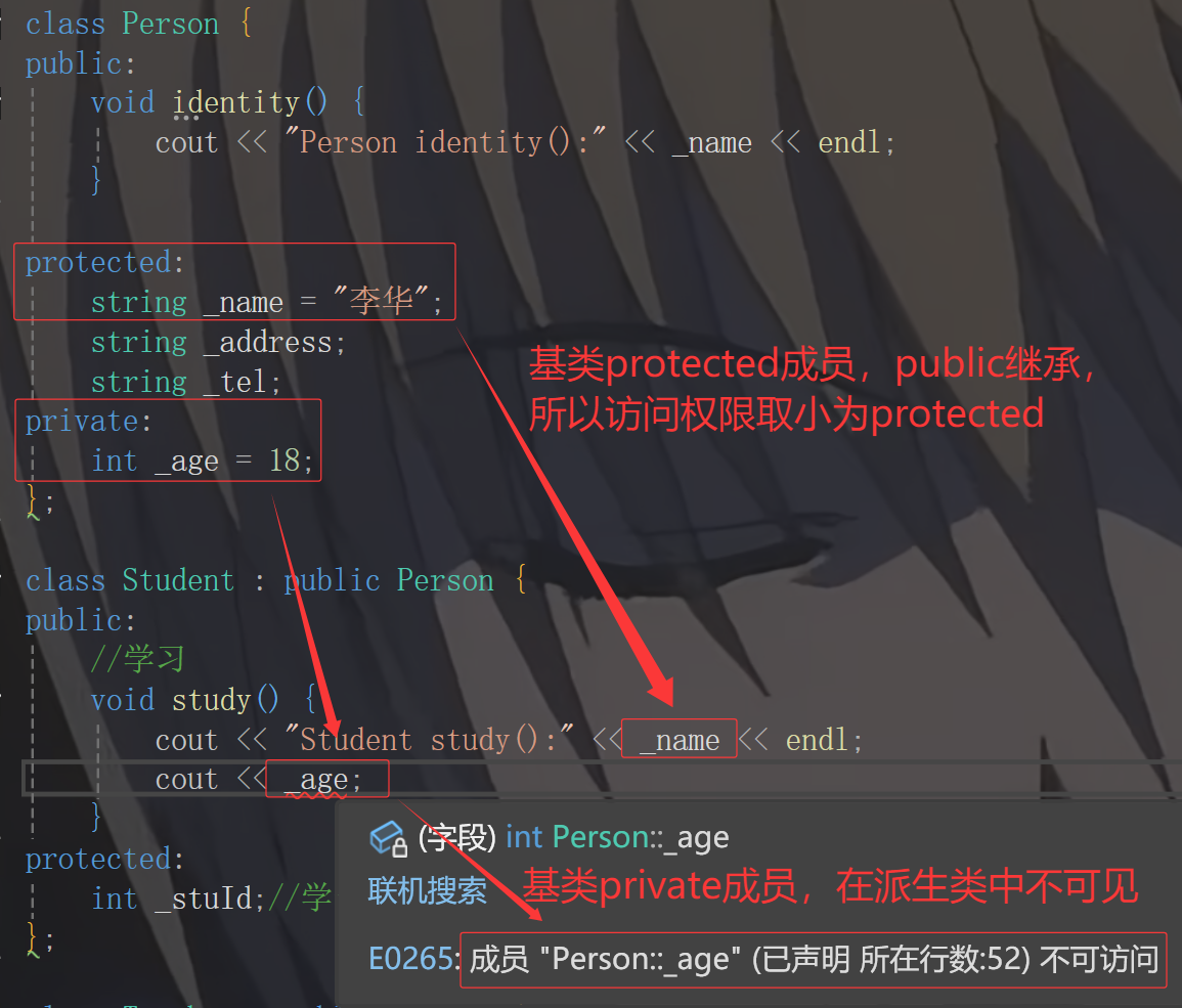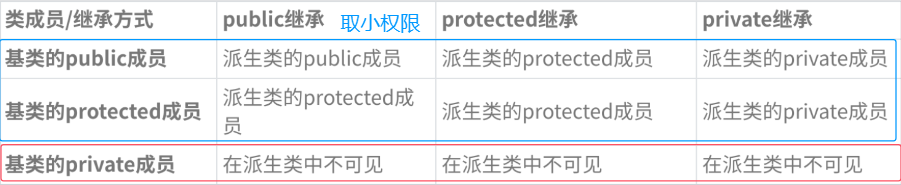 除开基类中的private成员在派生类中都不可见外,基类中其他的成员,在派生类中的访问权限 = Min(该成员在基类中的访问权限,继承方式),即取小的权限,其中public > protected > private.