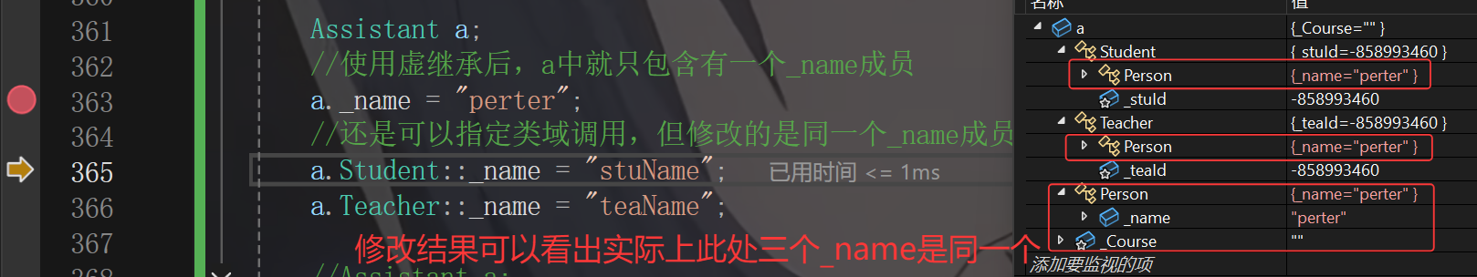 可以看到使用菱形虚拟继承后,a对象可以直接修改_name,因为此时已经没有二义性,而后续即便指定类域修改,实际上修改的也是a中的同一个成员_name。需要注意的是,监视窗口显示的并不是底层的实际内容,此处是为了便于观察,才看起来像是有三份来自Person的_name,实际上只有一份。