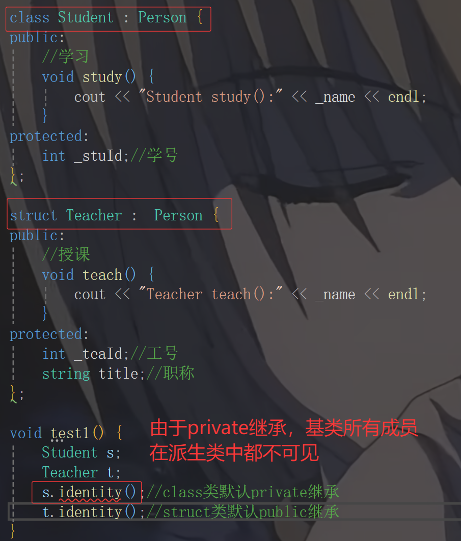 创建一个类时,用" : "跟上继承方式(继承方式可以不声明,此时class默认private,struct默认public)和继承的基类,就创建出一个派生类,派生类会继承基类的属性和方法