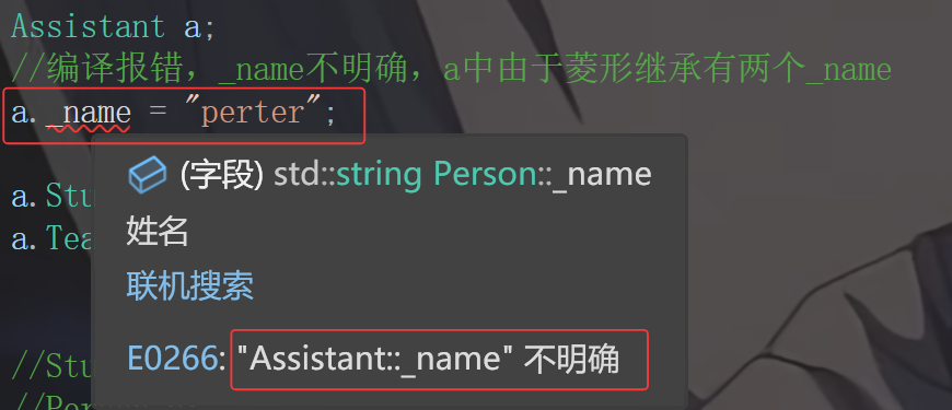 //可以显示指明类域来解决二义性,但数据冗余无法解决(此处不需要两个名字)