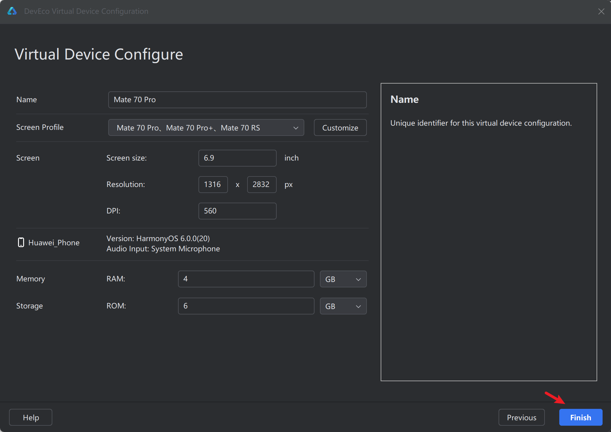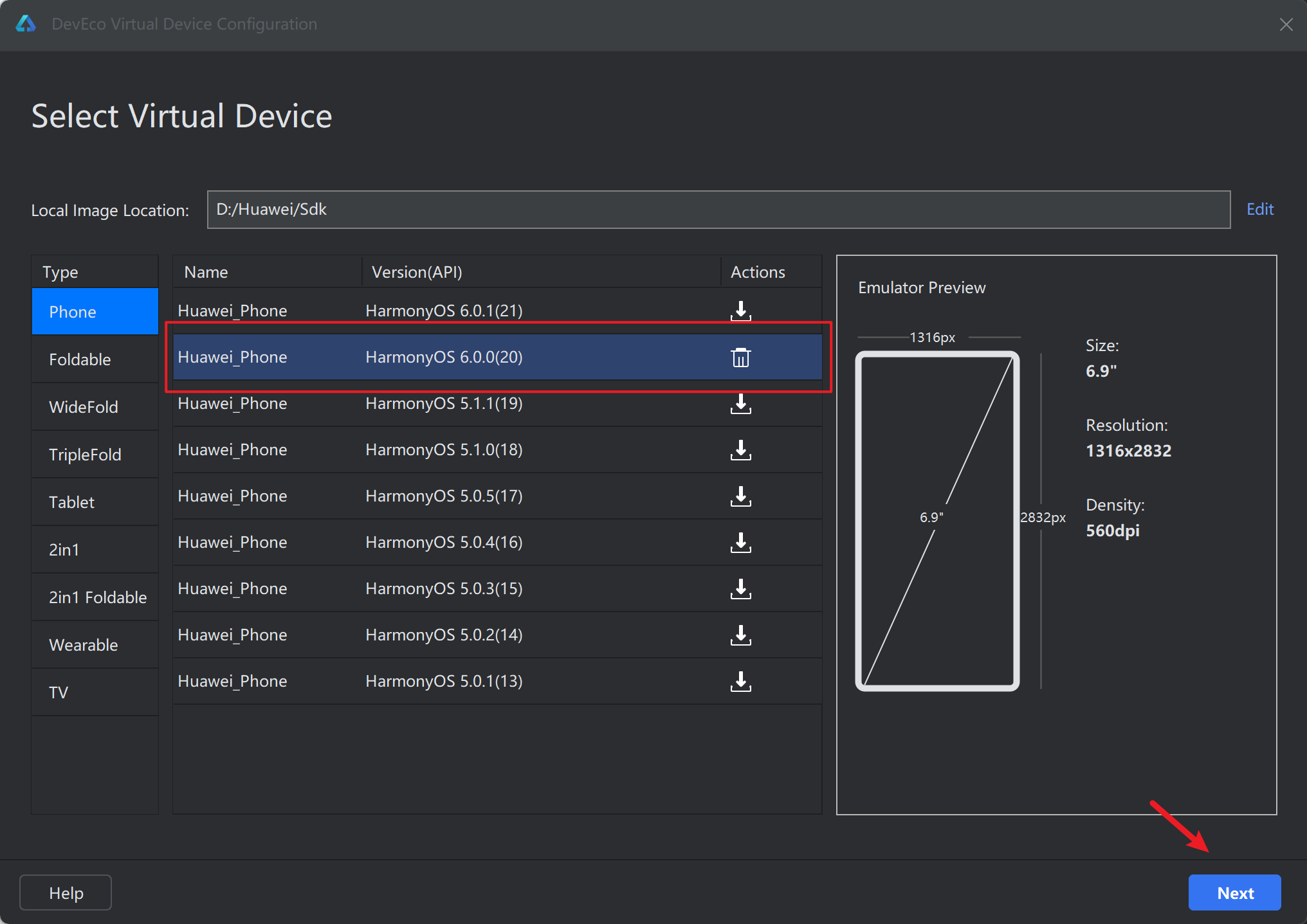 📱 找到名称为 "Huawei_Phone" ,版本号为 "HarmonyOS 6.0.0(20)" 的镜像