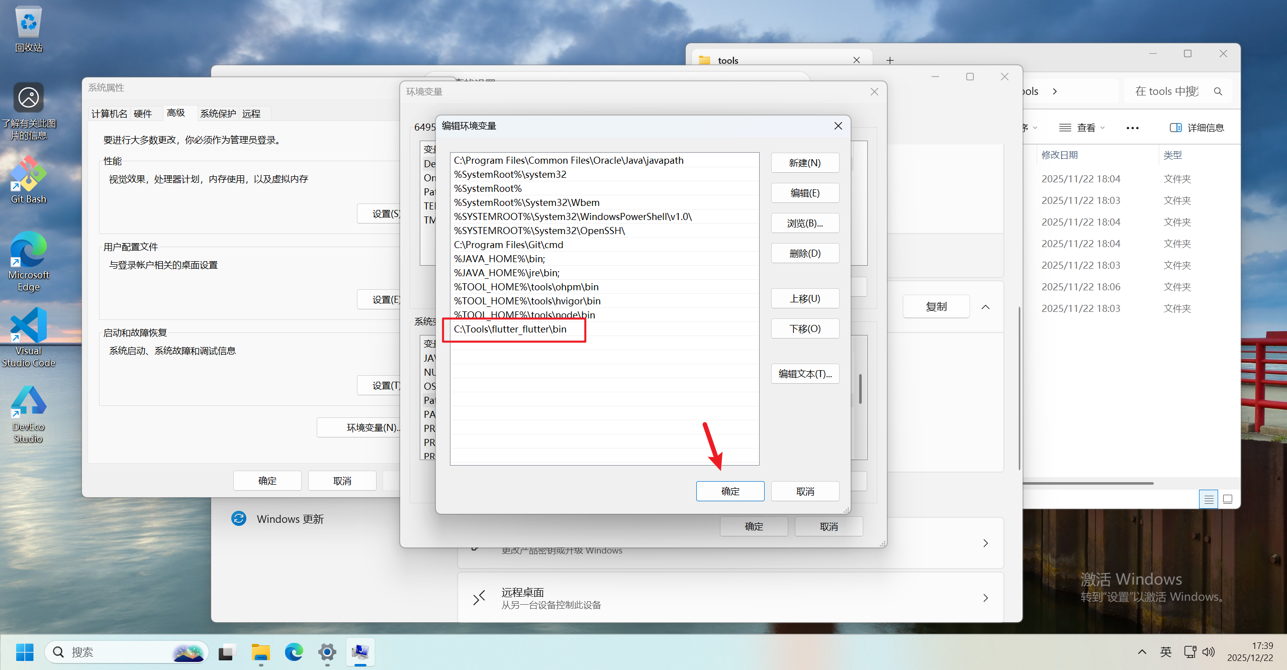 C:\Tools\flutter_flutter,则添加C:\Tools\flutter_flutter\bin - 如果克隆到