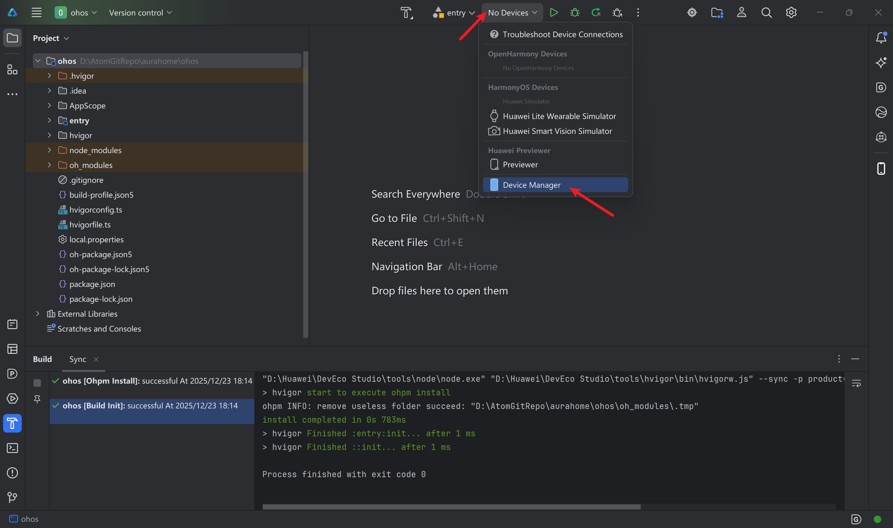 🔍 在 DevEco Studio 顶部菜单栏,找到设备管理图标