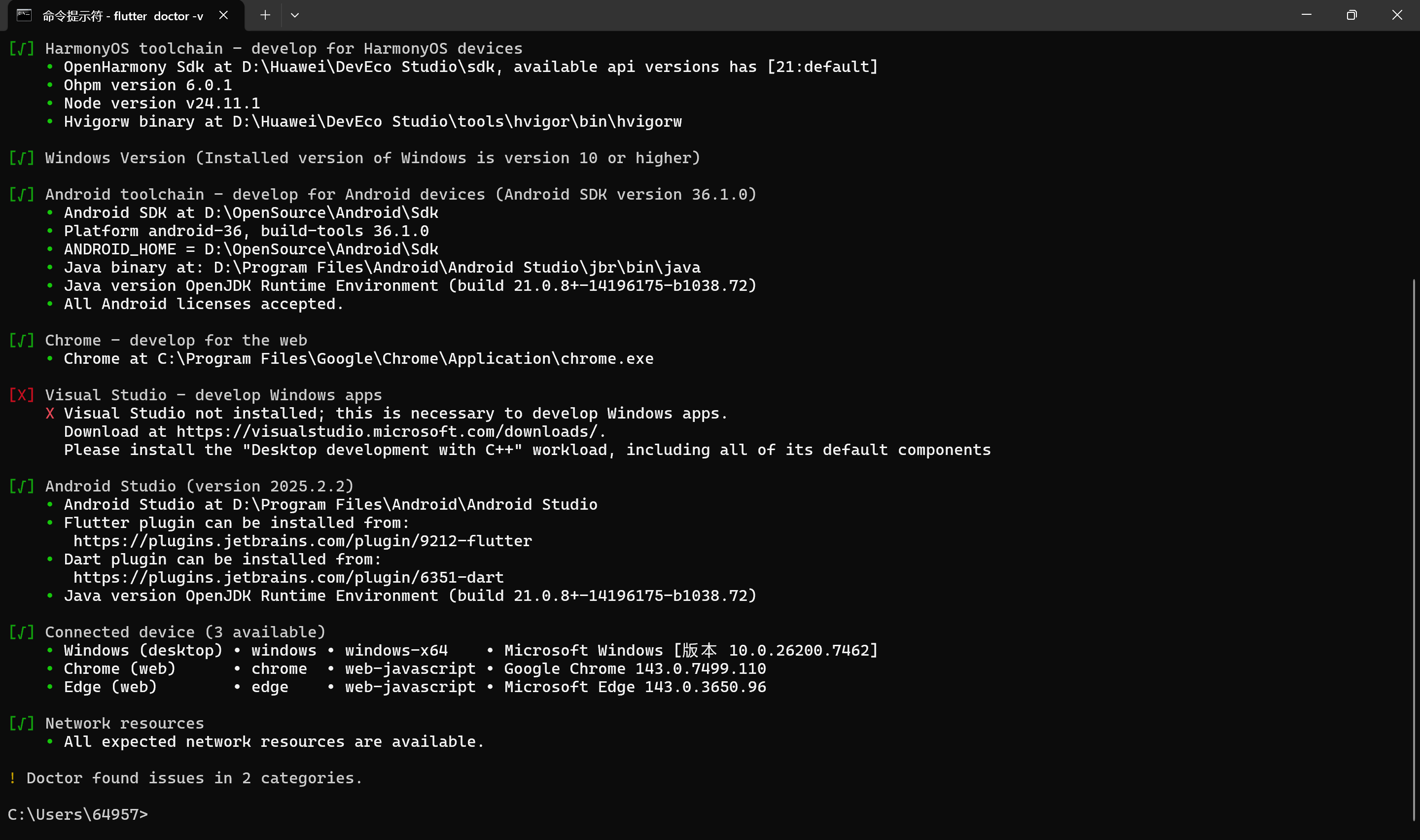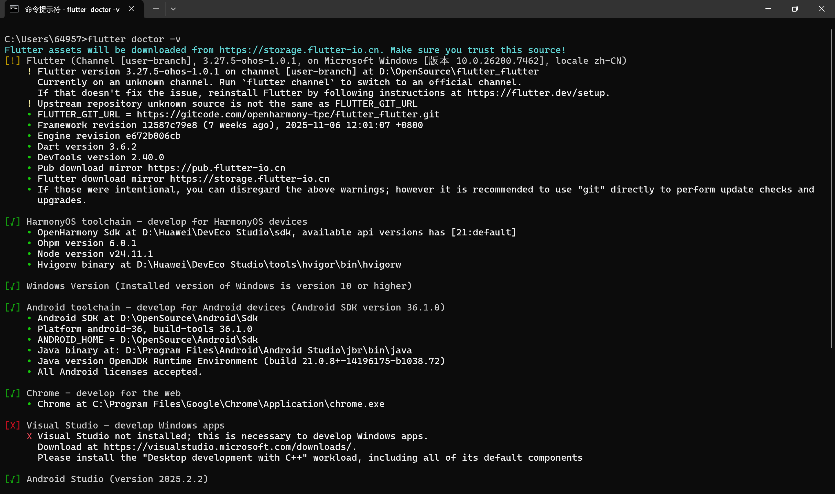 期望输出 :应该显示环境检查结果,Flutter、OpenHarmony、Android 都应该显示为 ✓ 或 ok。