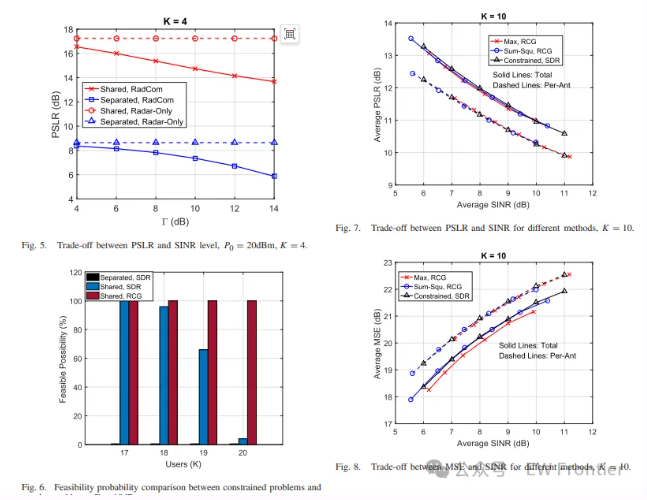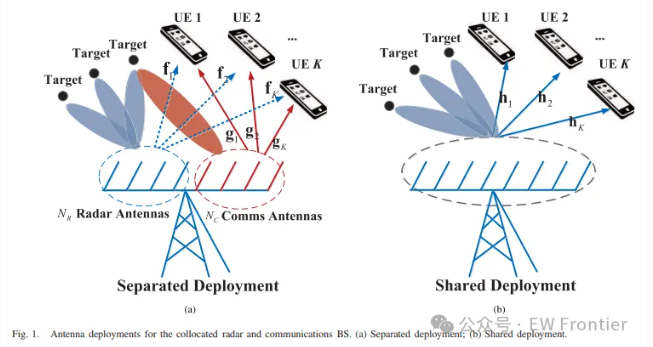 分离部署:天线分为雷达天线(N_R)与通信天线(N_C),雷达信号通过零空间投影消除对通信用户的干扰,通信侧通过优化协方差矩阵匹配雷达波束图,同时满足SINR与功率约束。
