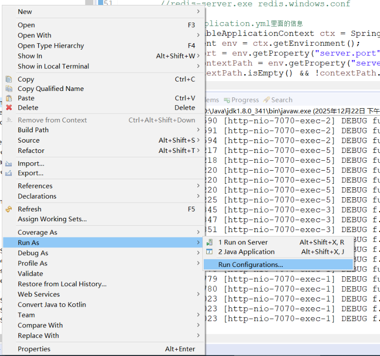 点击你的 Java 项目 / 类 → 选择 Run As → 选择 Run Configurations