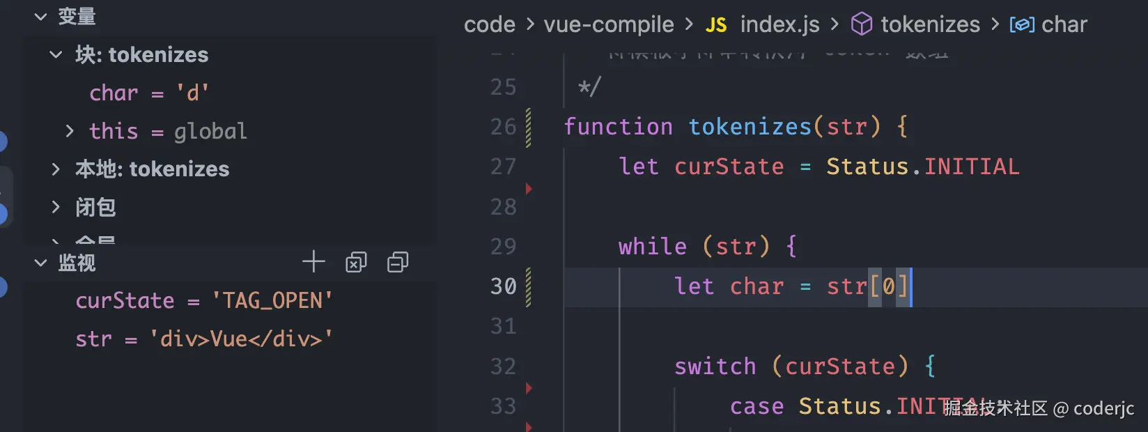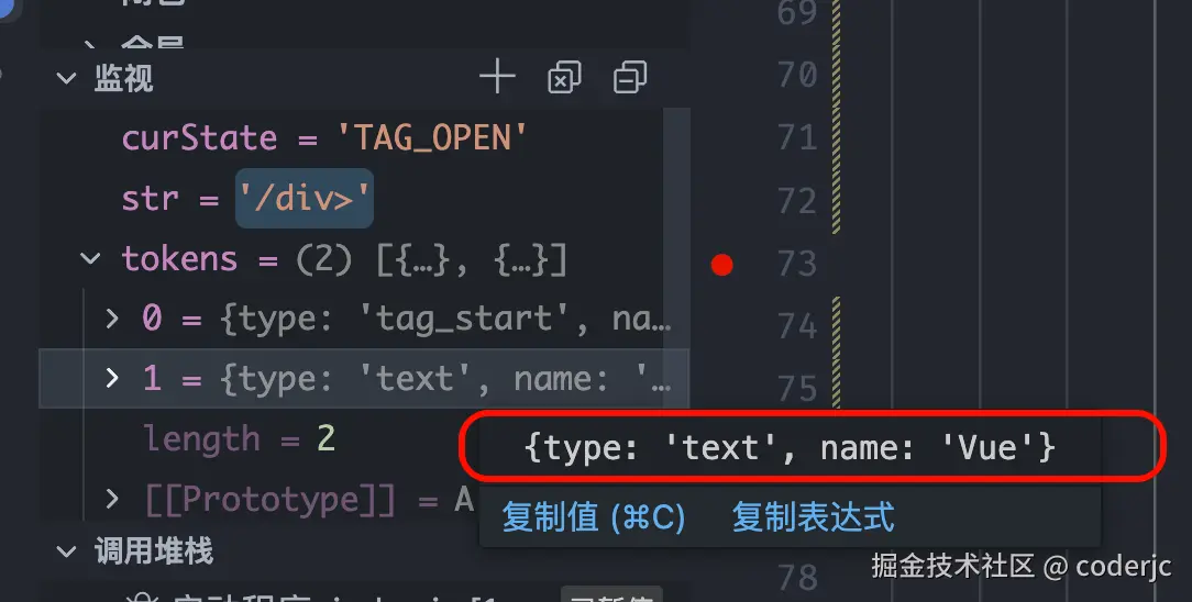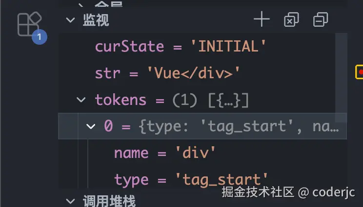 - 词法分析:将代码字符串分解成一个个有意义的词法单元(token)