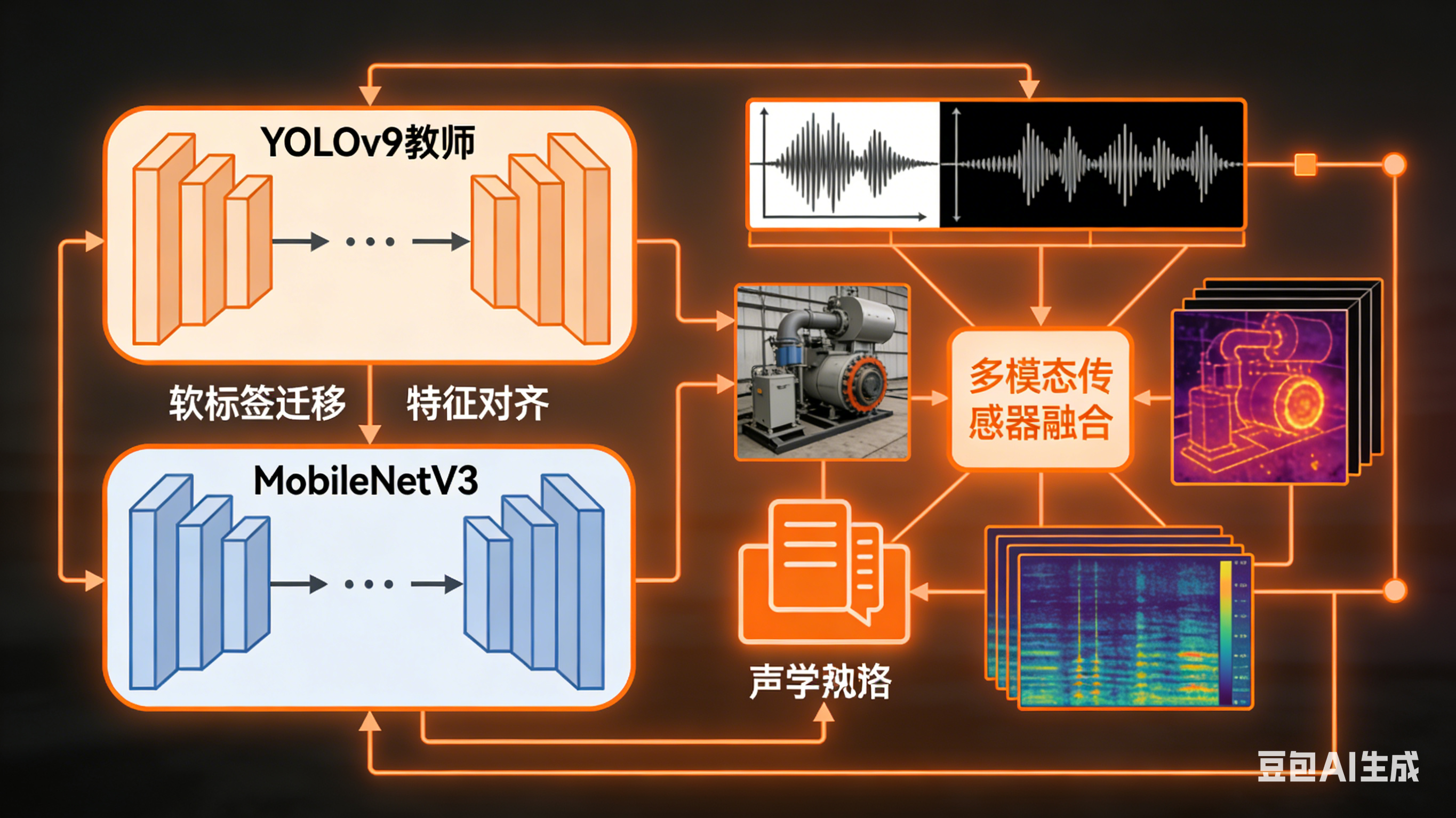 系统核心采用知识蒸馏技术 ,以性能强悍的YOLOv9作为"教师模型",MobileNetV3作为"学生模型",实现"高精度+轻量化"的平衡。YOLOv9凭借先进的C2f模块与ELANv2结构,具备极强的复杂故障特征提取能力,能精准识别设备振动异常、温度异常、声学异响等多类故障模式;通过蒸馏策略(软标签迁移+特征对齐),将YOLOv9的诊断经验与核心特征"传授"给MobileNetV3,在剔除冗余参数的同时,完整保留故障识别精度,最终将模型体积压缩至14.7MB,仅为原始YOLOv9模型的1/20,完美适配边缘设备资源约束。