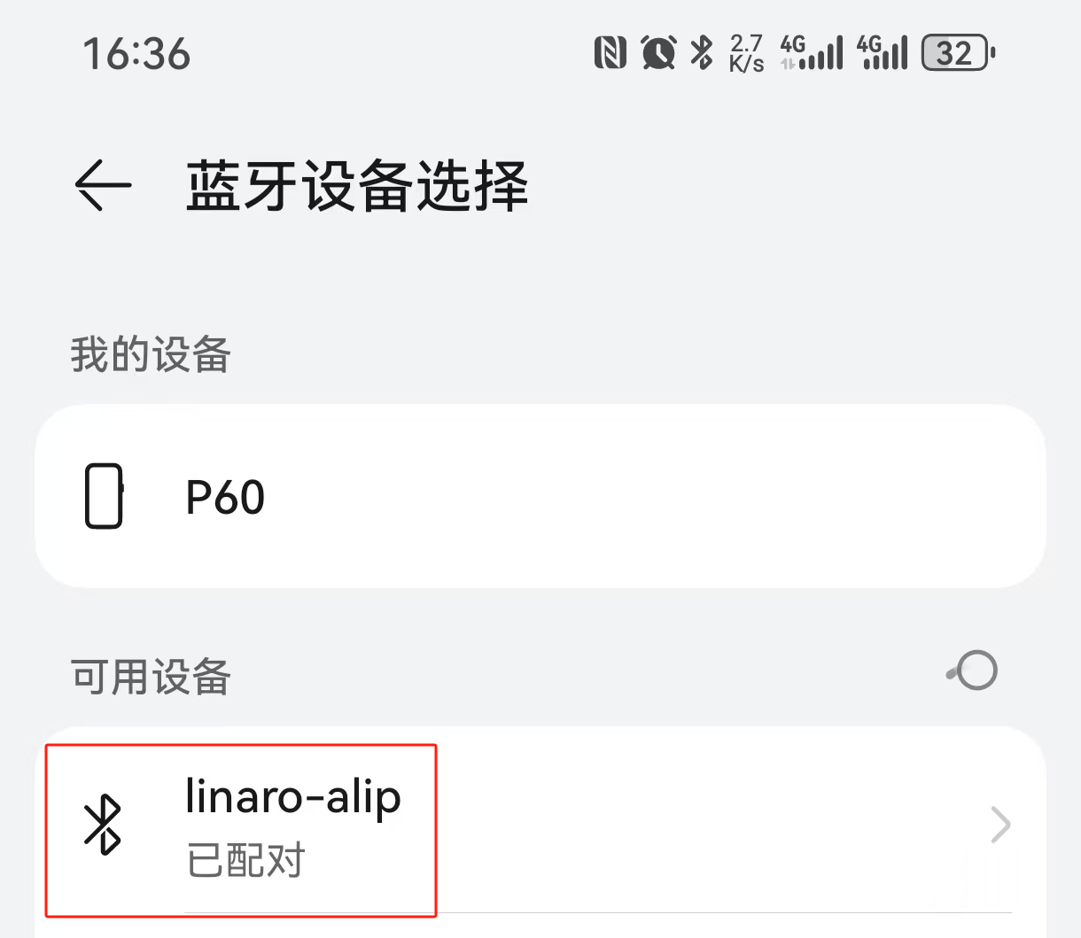 测试需要一部智能手机(该小节测试使用的是安卓手机),打开手机蓝牙功能,并且打开开发板蓝牙功能,然后进行连接,如下图所示:
