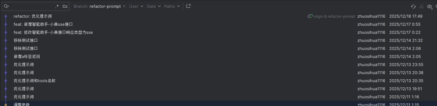 我在 refactor-prompt 分支上,提交了大量零碎 commit,例如:
