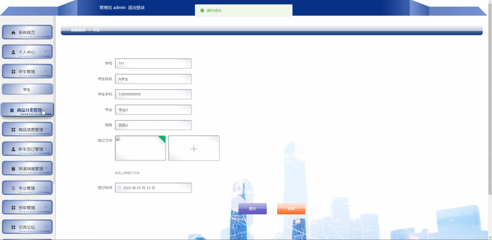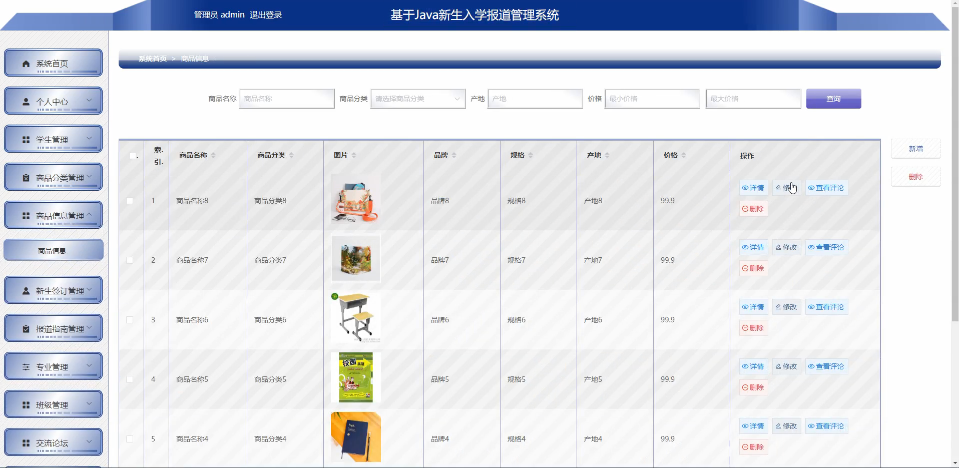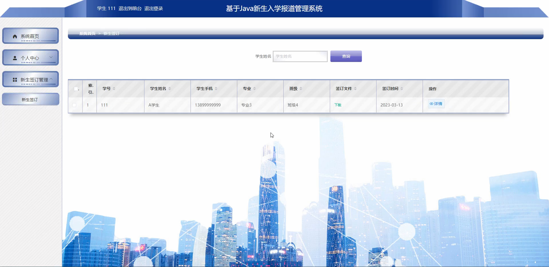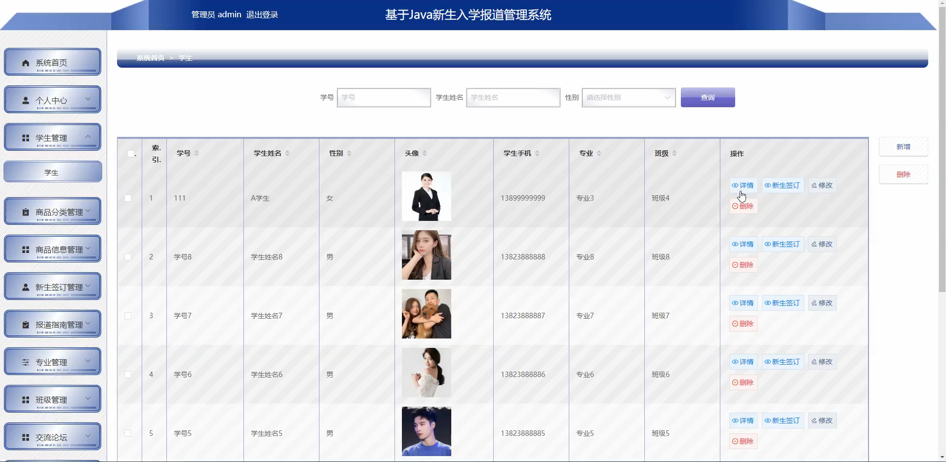 - 信息管理模块:支持新生在线填写个人信息、上传证件照片等,管理员在线审核信息。