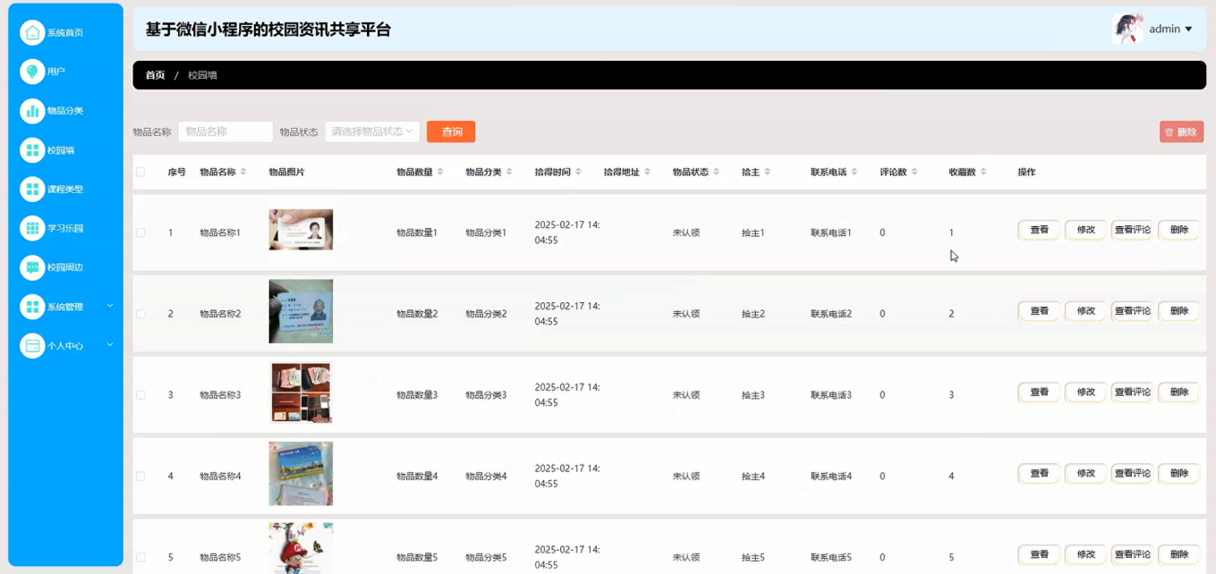 核心管理功能:用户管理(统筹平台用户信息)、物品分类管理(规范校园物品分类体系)、校园墙管理(审核、维护失物招领等资讯,支持查询、修改、删除、批量删除操作)、课程类型管理(梳理各类课程类型信息)、学习乐园管理(运营管理学习资源与活动)、校园周边管理(整合商家信息,支持新增、查询、修改、删除等操作)、系统管理(保障平台稳定运行与功能优化)。