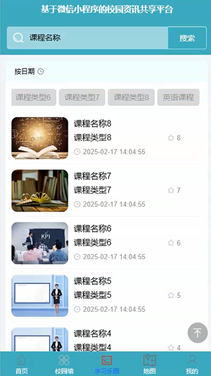 核心使用功能:校园墙(浏览、发布资讯与失物招领信息,参与互动)、学习乐园(搜索、筛选、查看课程资源,收藏感兴趣课程)、地图功能(查询校园及周边地理信息)、我的收藏(管理收藏的资讯与资源)。