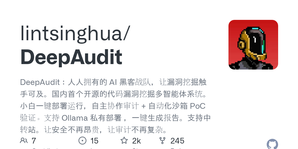 - 💡 推荐语: DeepAudit是国内首个开源代码审计多智能体系统,让小白也能一键部署AI黑客战队,实现自主协作挖掘漏洞并自动化验证,大幅降低安全审计门槛与成本。