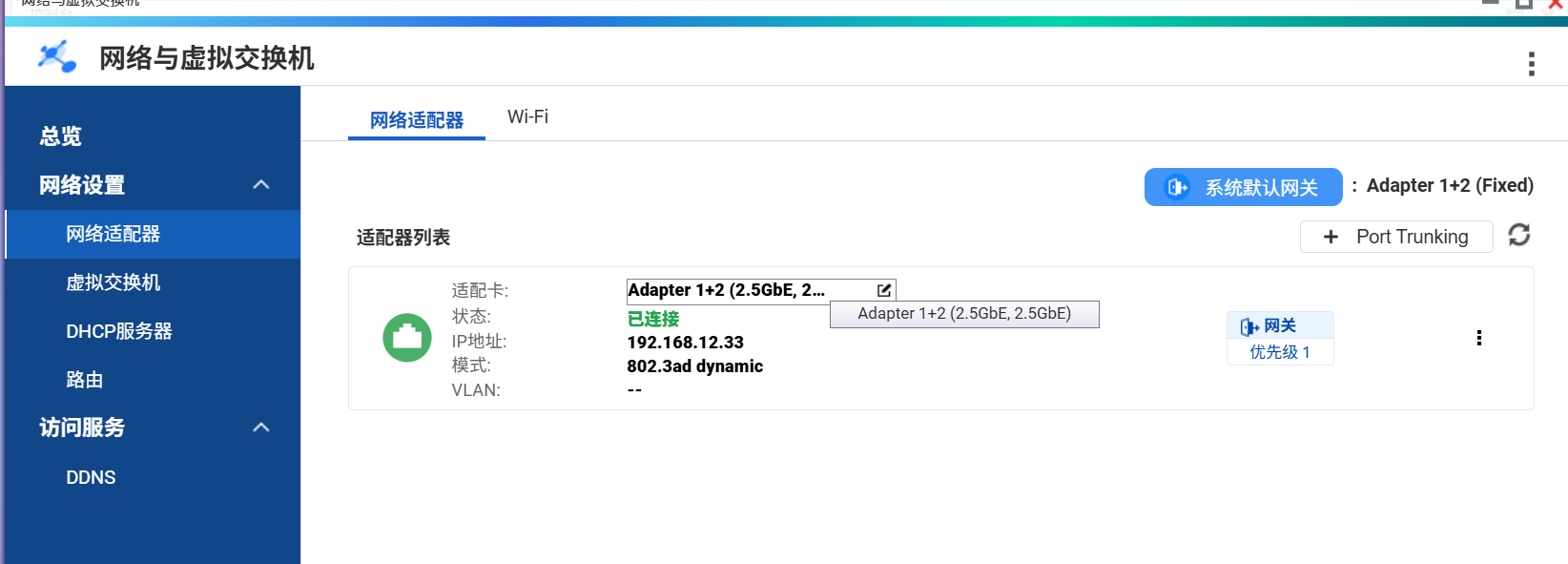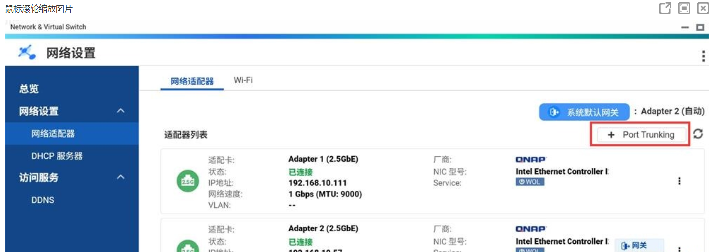 - 打开威联通控制台的"网络和文件服务 - 网络与虚拟交换机(Network&Virtual Switch)- Port Trunking - 新增 - 添加"。