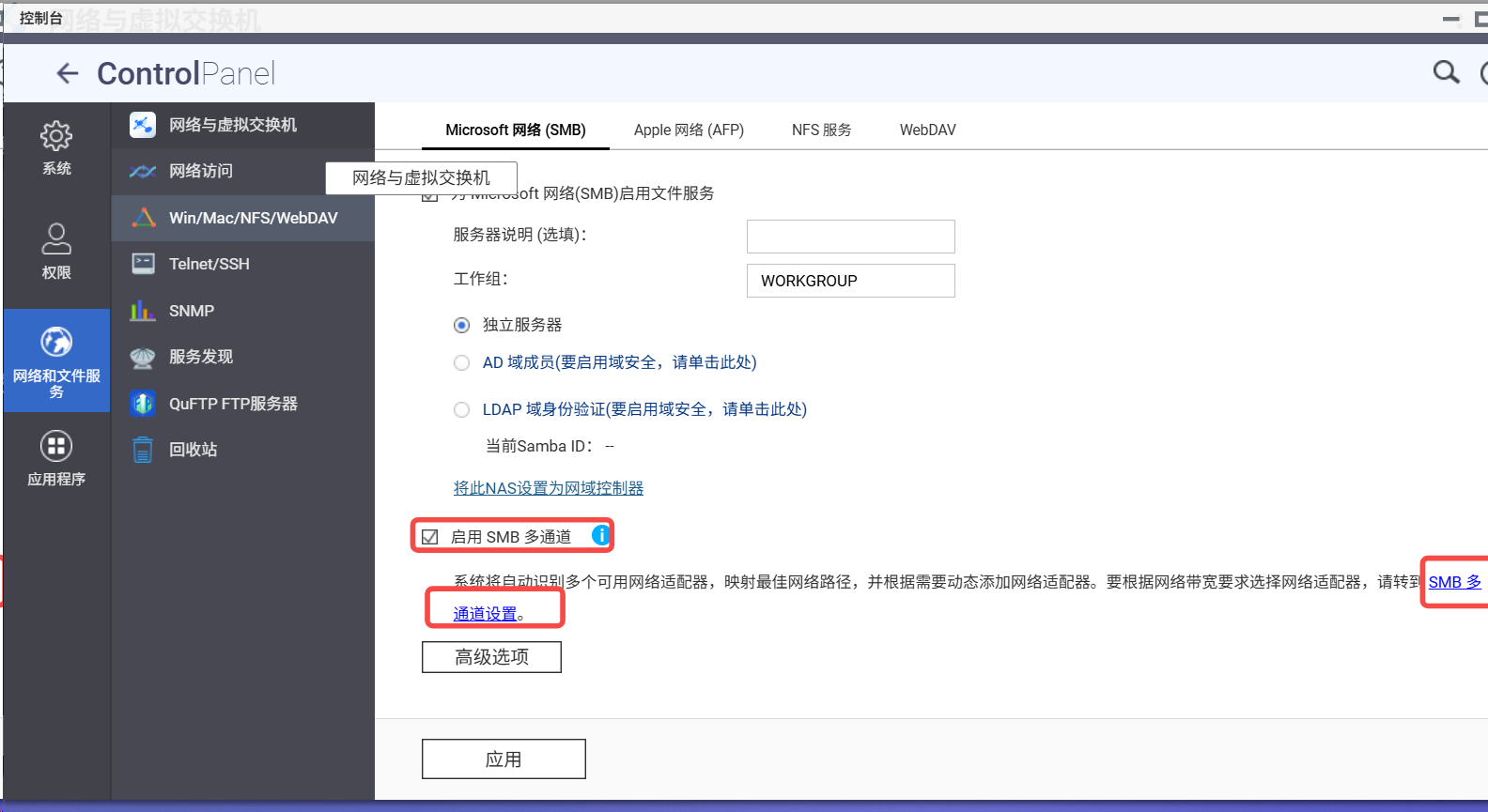 打开威联通控制台的"网络和文件服务 - Win/MAC/NFS/WebDAV - 微软网络(SMB)",勾选"启用 SMB 多重通道",点击"应用"。然后点击"SMB 多重通道设置"。