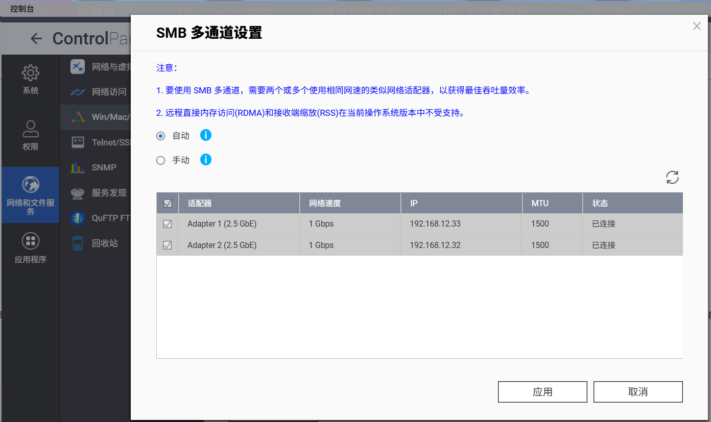 威联通NAS双网卡双倍速度聚合+SMB多通道设置的方法