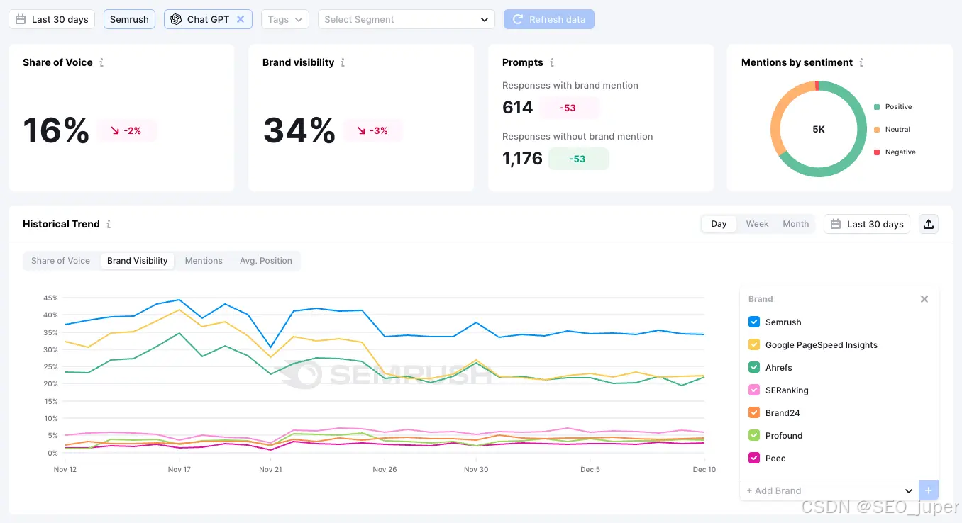 Sermrush的Enterpirse AIO工具每天监测您的品牌在AI结果中的存在,帮助您及时了解可见度的变化。