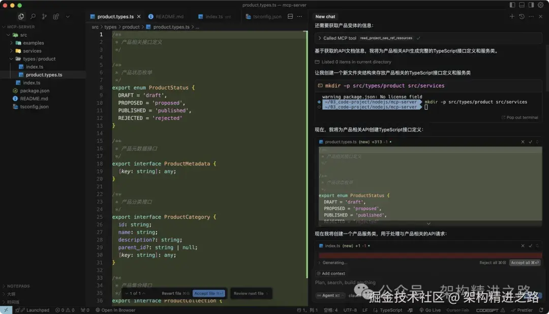 最大好处就是: 你写代码、搞业务,不用死记硬背 API 接口或者反复翻查文档,只要告诉 AI:"根据 API 文档,把 Product 接口一键生成出来"、"在 DTO 里多加几个新字段"、"所有字段写详细注释"......AI 就帮你自动做好,真正实现专业代码、接口、注释"写出来即是规范,改一行全同步"。