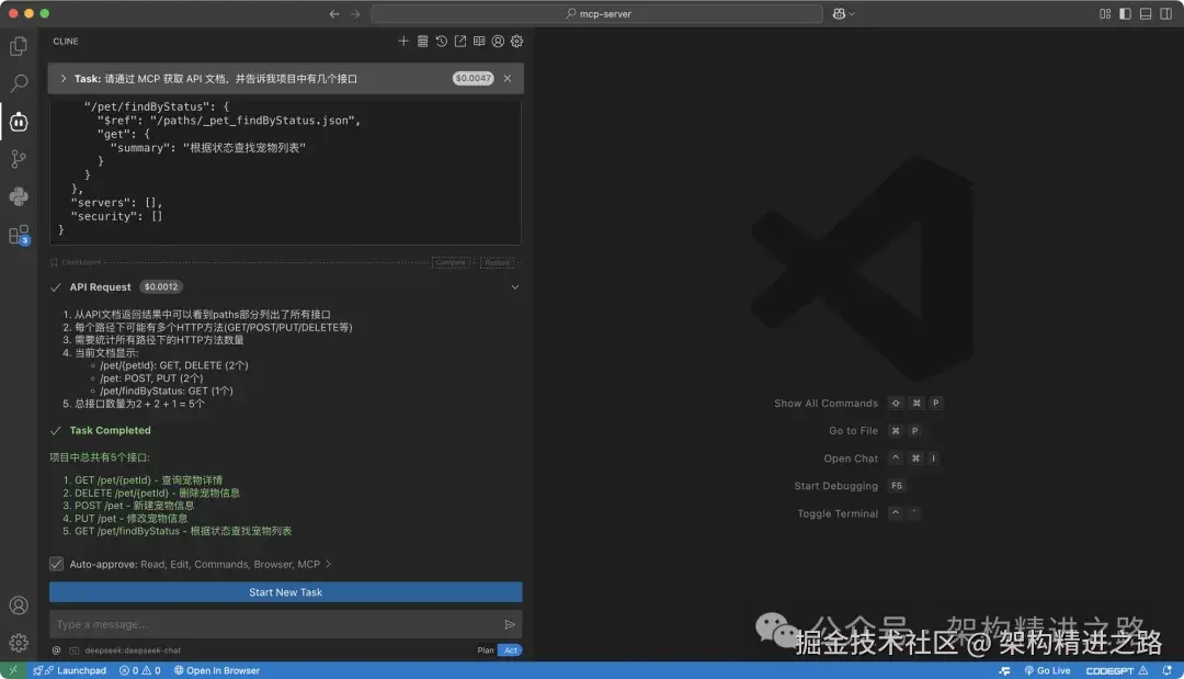 如果你"死忠" VSCode 用户,推荐试试 Cline 插件。它能把 AI 助手直接集成进 VSCode 里面,和编辑器无缝协作。你在 VSCode 里写代码、查 API、提需求,它都能帮你生成、补全、重构,还能一键连接 Apifox MCP Server,帮你自动获取和利用 API 文档。这样开发就变成了"VSCode 写- Cline 想 - AI 出结果",整个体验超级丝滑。