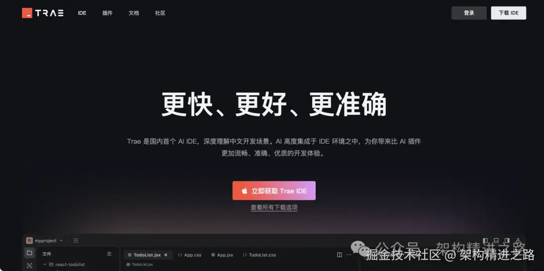 Trae.ai 也是个 AI 编程 IDE,字节跳动的产品,目前是免费使用,写代码、查文档、加接口都可以,和它对话就能改功能、查问题,事半功倍。