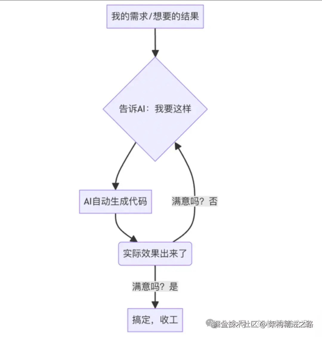 我直接说结论:Vibe Coding 压根就不关心你代码具体怎么实现的,核心关注点是代码生成的结果对不对。至于实现逻辑、底层细节这些繁琐的活,都交给 AI 去搞定。我只需要盯着效果,觉得哪里不对、哪里有问题,就直接改 prompt,重新提需求,AI 会自动帮你调整和优化,直到最后结果完全符合你的预期为止。整个过程你都沉浸在 "说想法--->看结果--->继续调整--->再出结果" 的循环里,效率高得飞起。