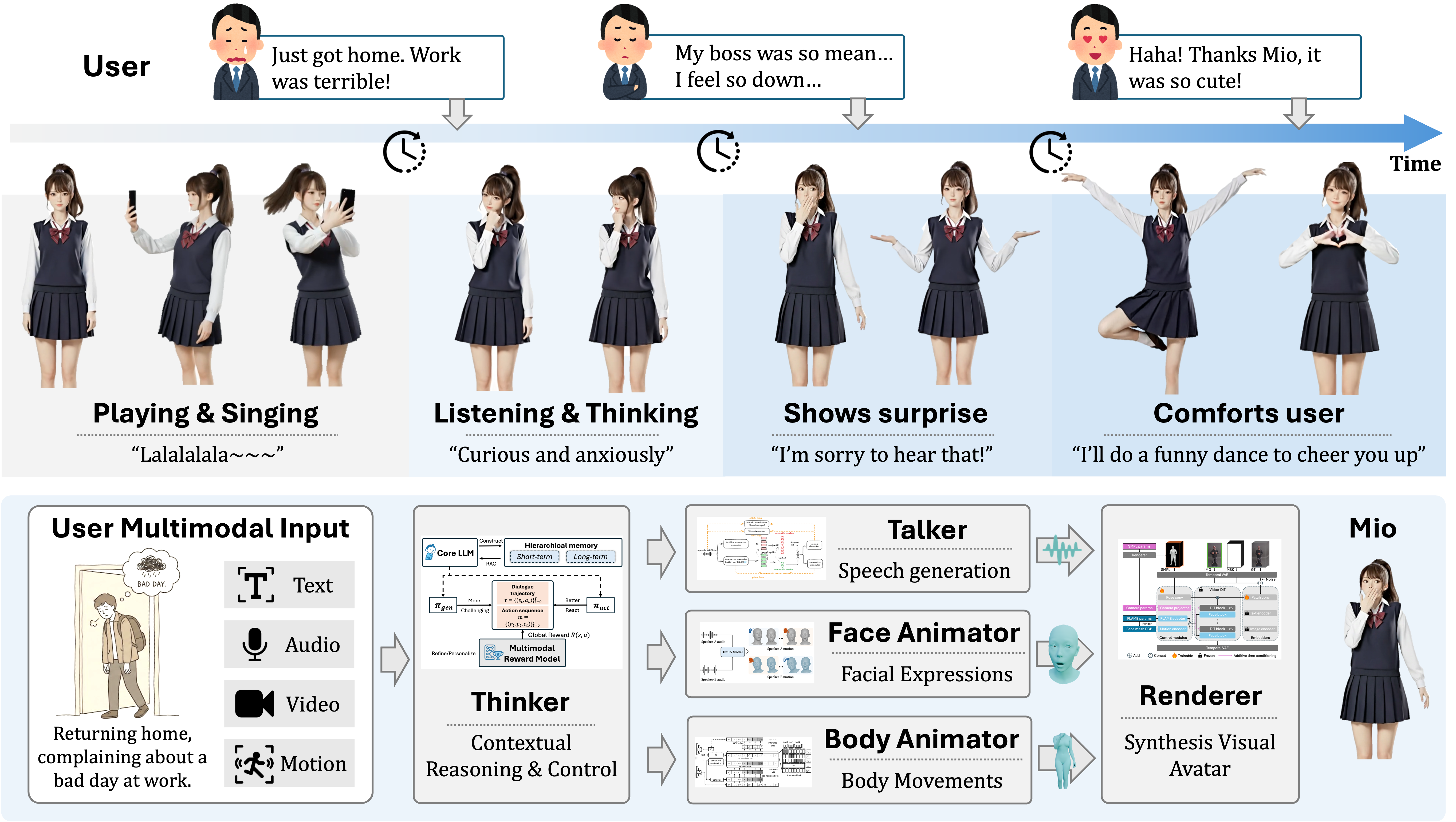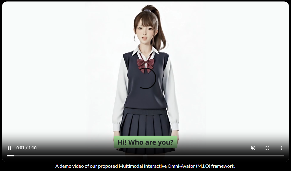 M.I.O(Multimodal Interactive Omni-Avator,多模态交互式全维度智能体)是由盛大AI研究院东京分部(Shanda AI Research Tokyo)联合东京大学、东京理科大学团队研发的数字人智能框架,核心目标是突破现有数字人的"模仿性局限",实现具备真正交互式智能的数字人系统,相关研究成果已以论文形式发布于arXiv(2025年,编号2512.13674,领域:cs.CV)。