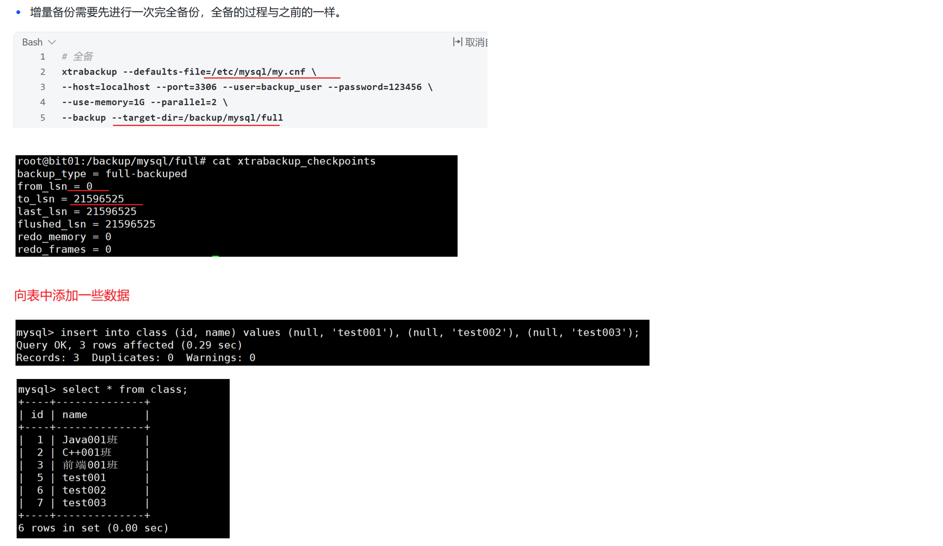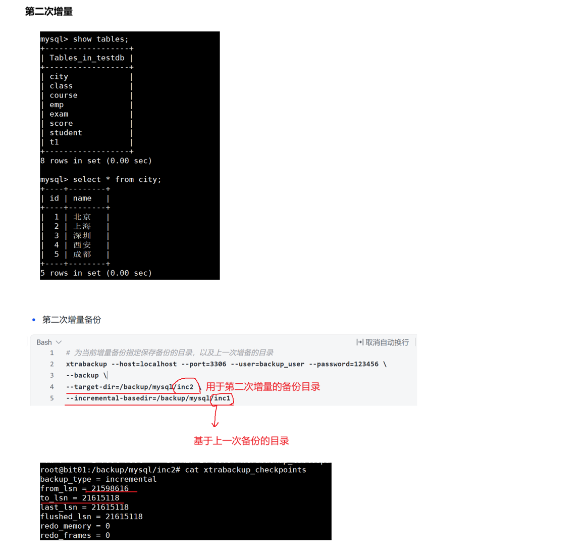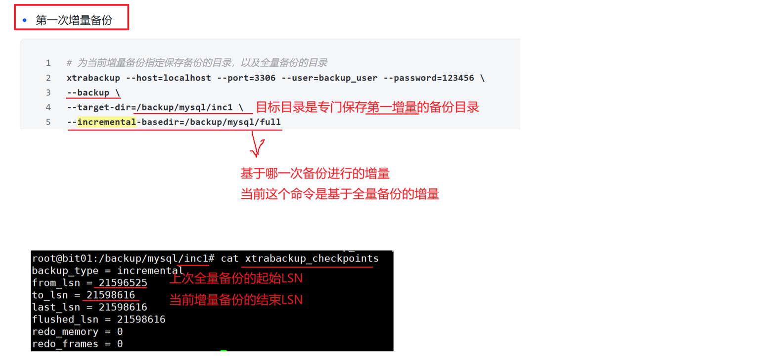 # 为当前增量备份指定保存备份的⽬录,以及上⼀次增备的⽬录