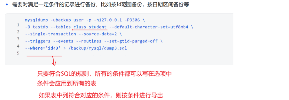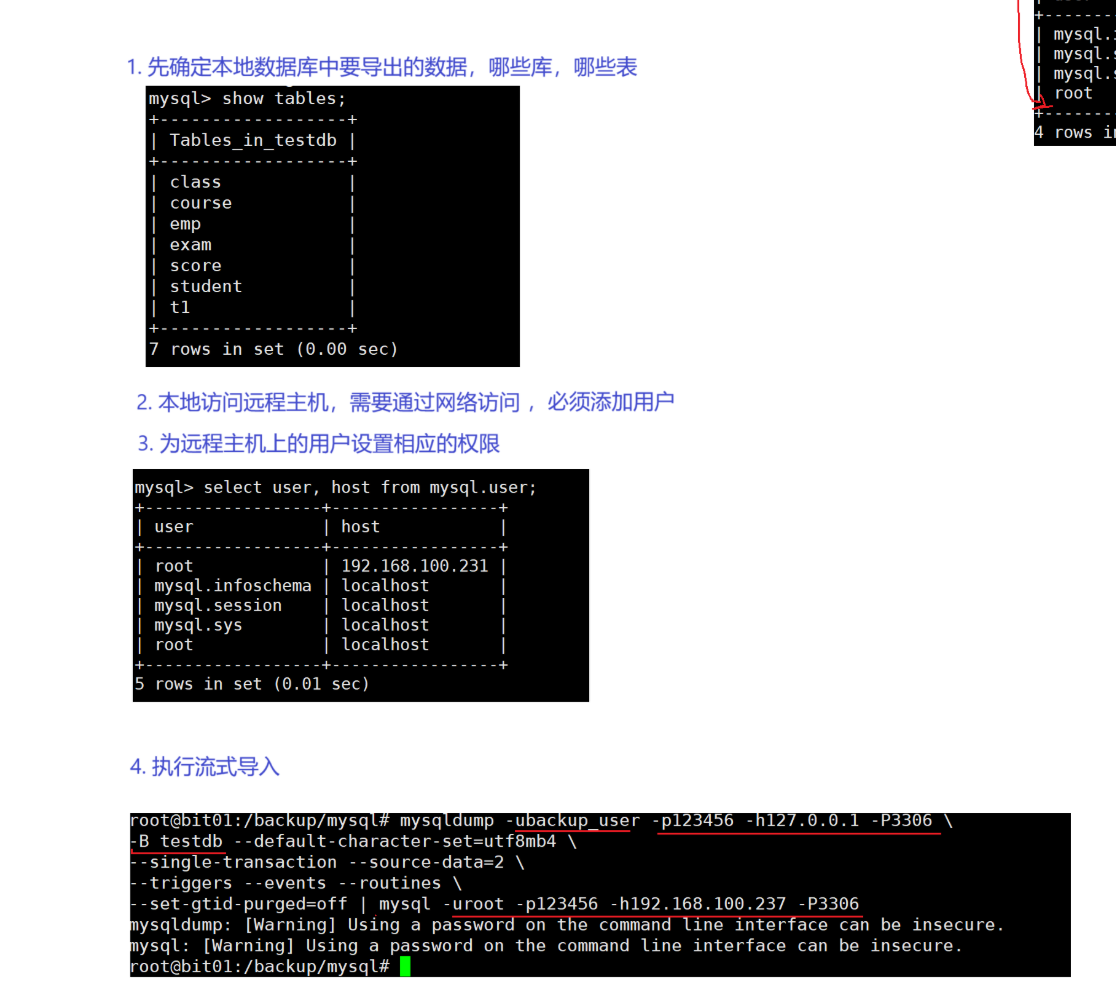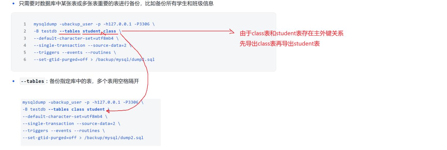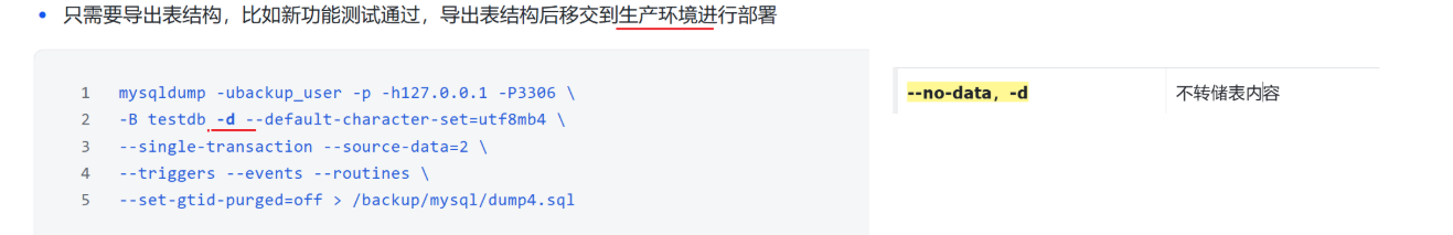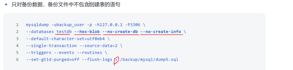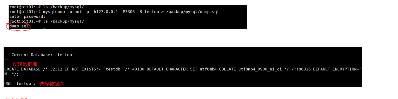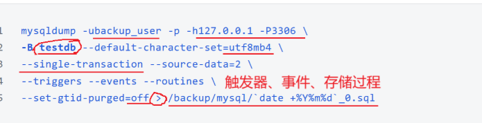 mysqldump -uroot -p -h127.0.0.1 -P3306 -B testdb > /backup/mysql/dump.sql
