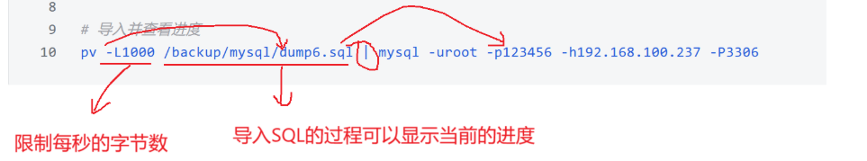 pv -L1000 /backup/mysql/dump6.sql | mysql -uroot -p123456 -h192.168.100.237 -