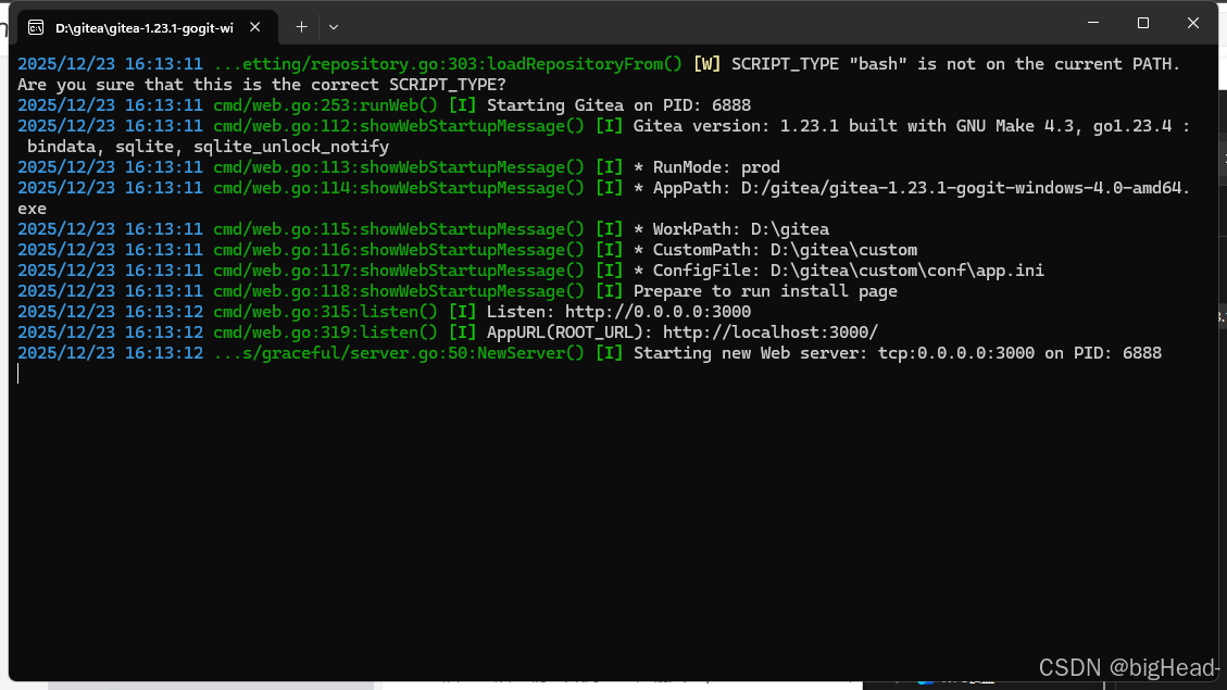 gitea.exe文件,会弹出一个 DOS 命令行窗口,表示 Gitea 正在启动。 - 默认情况下,Gitea 会监听