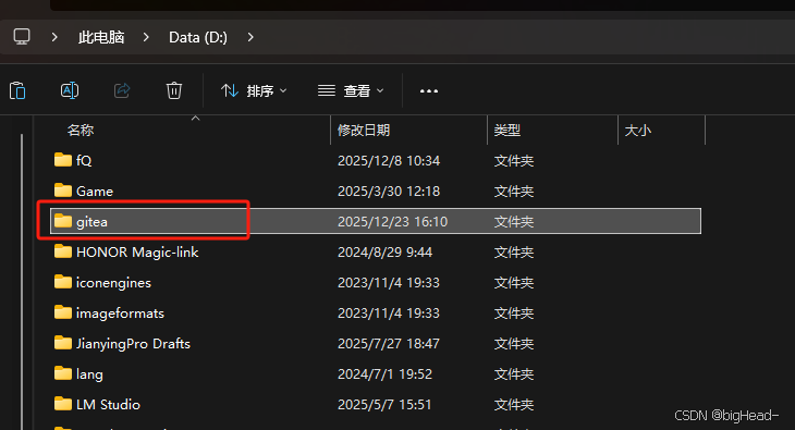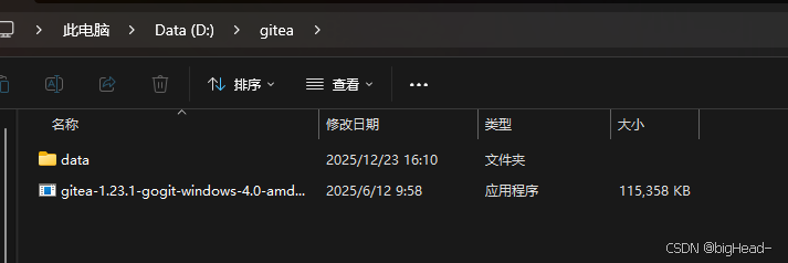 D:\gitea文件夹下新建一个data文件夹,用于存储 Gitea 的数据库和配置文件。