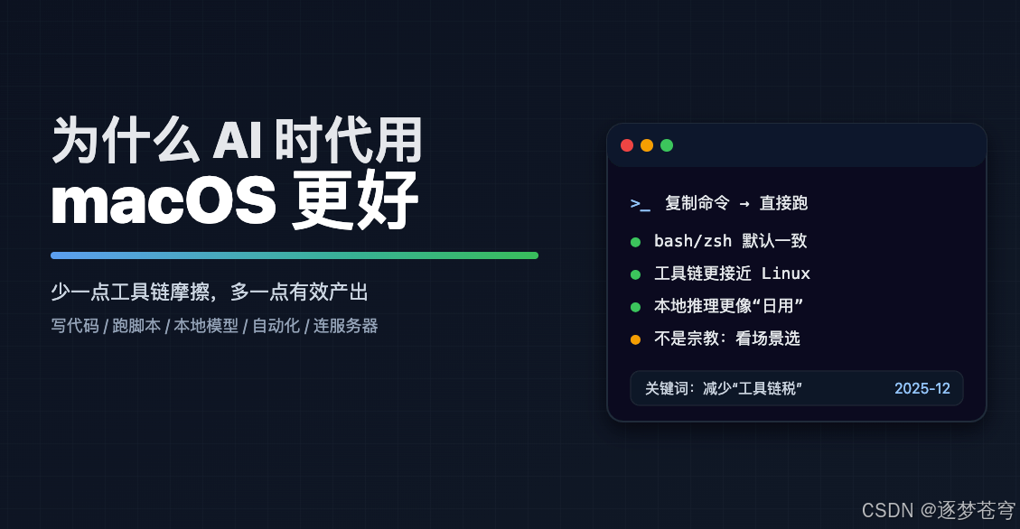 我这篇文章的核心观点很简单:在 2025 年底这个时间点,如果你的工作流和 AI 强相关(写代码/跑脚本/折腾模型/自动化/连服务器),macOS 的整体摩擦更低。不是说 Windows 不能用,而是:你往往要花更多时间把它"修成一台能顺畅做 AI 的机器"。