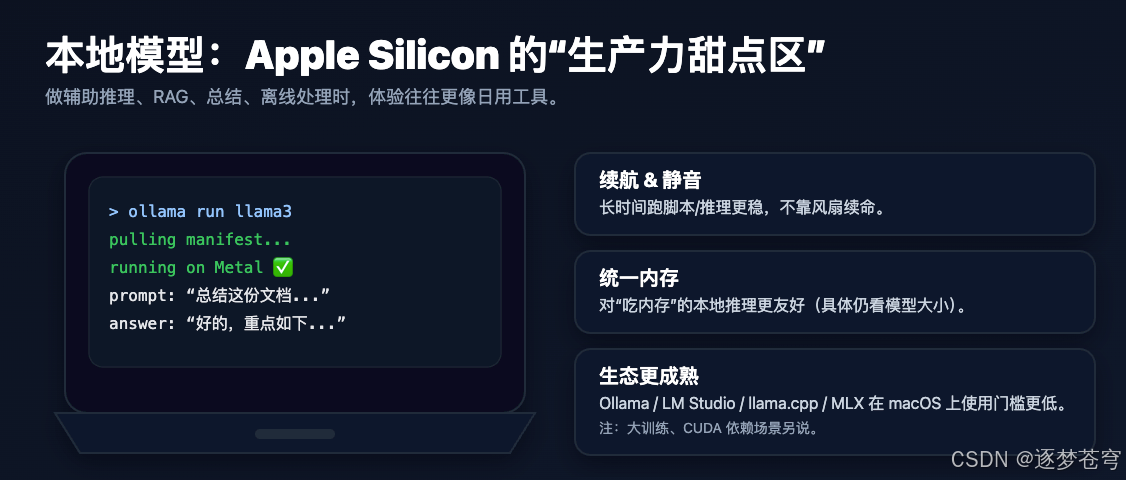 但如果你是下面这些场景------本地跑小/中型模型做辅助(RAG、总结、代码补全、离线私有推理),Apple Silicon 的体验经常很舒服: