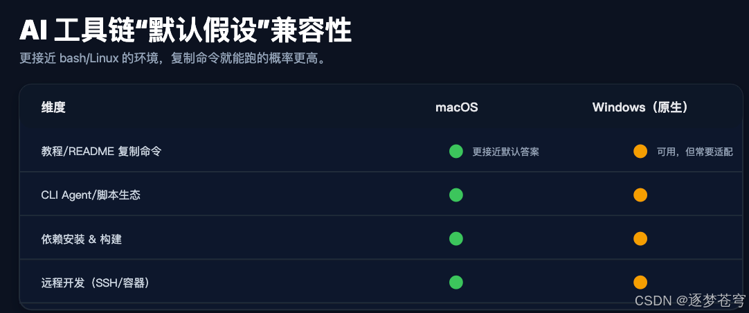 macOS 因为更接近 Linux 的工具链与文件系统习惯,很多"本地能跑 → 上线也能跑"的路更直;Windows 原生环境则更容易出现"本地是 PowerShell,线上是 bash"的两套世界观。