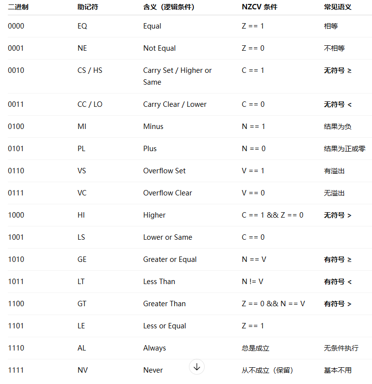 #nzcv:一个 4 位立即数,取值范围:0-15(2⁴-1),直接指定 N、Z、C、V 的值(当条件不满足时使用)