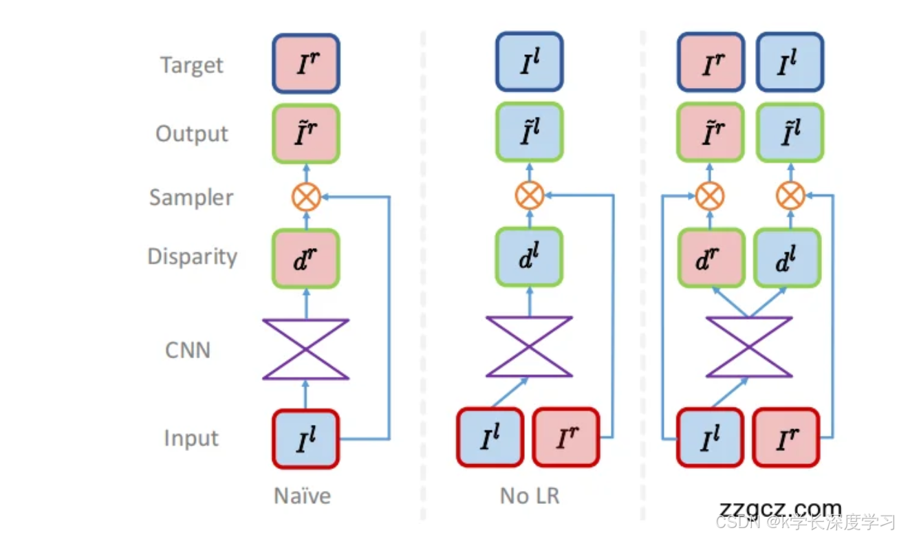 Output / Target:输出是重建的图 I~,与真实的目标图 I 做外观匹配损失(像素 L1 + SSIM);还会加视差平滑损失与(如果有)左右一致性损失