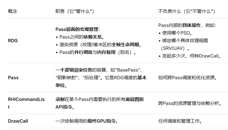 RDG管理的是一帧内所有Pass的"调度、依赖和资源",但Pass内部具体的"渲染操作指令"(如设置PSO、发起DrawCall)并不由RDG直接定义或包含。